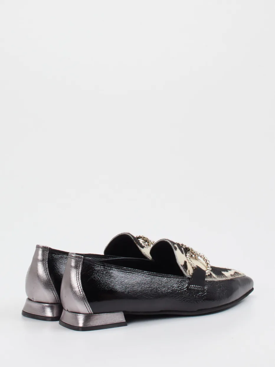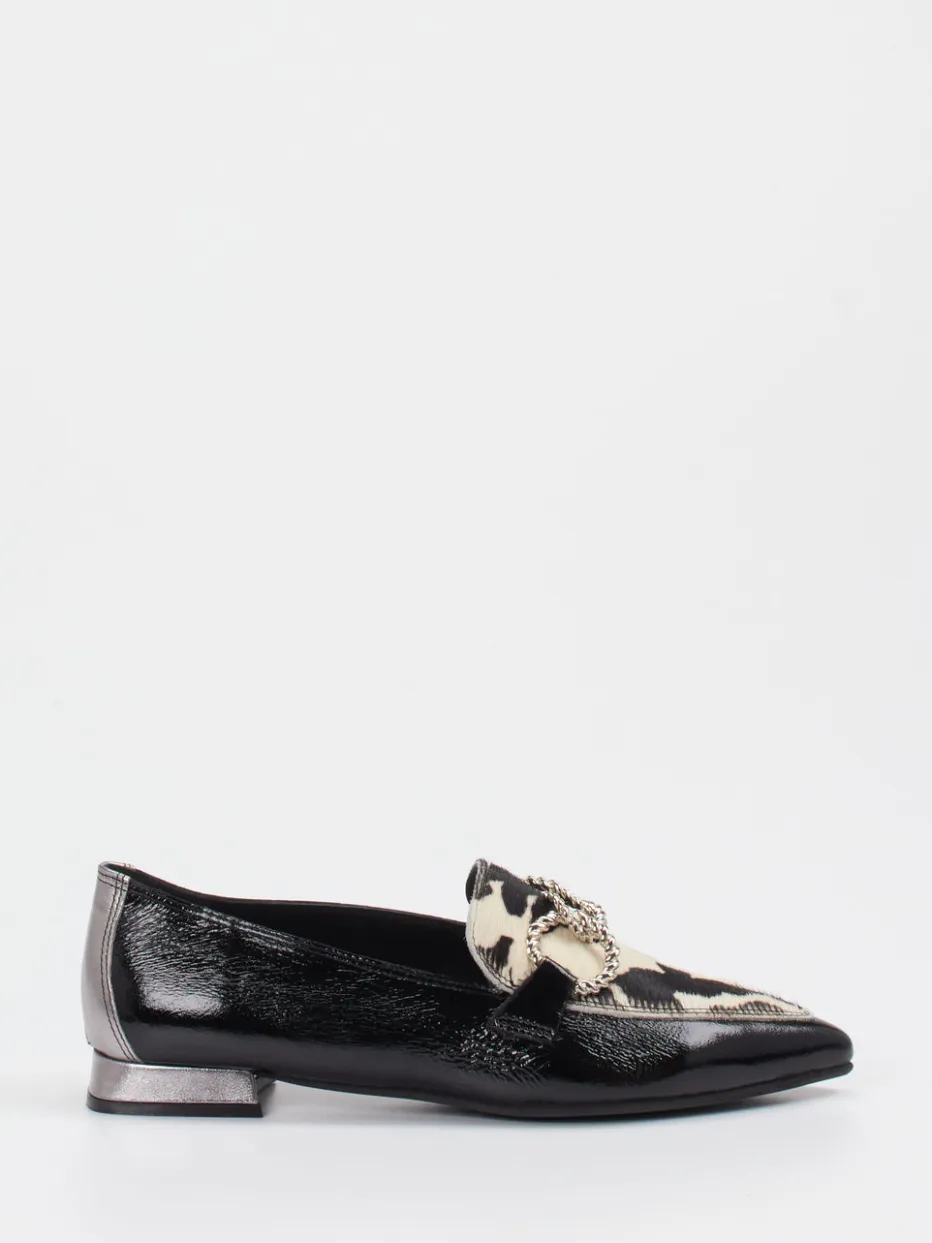 Ein stilbewusster Loafer, der durch den Materialmix aus Lackleder und Ponyfell sowie silberne Akzente zum modischen Highlight avanciert.