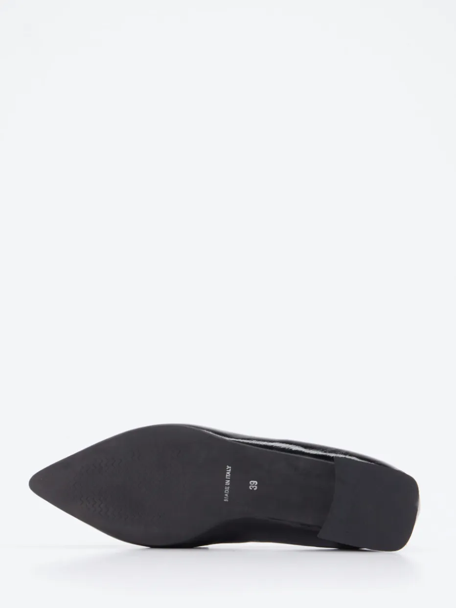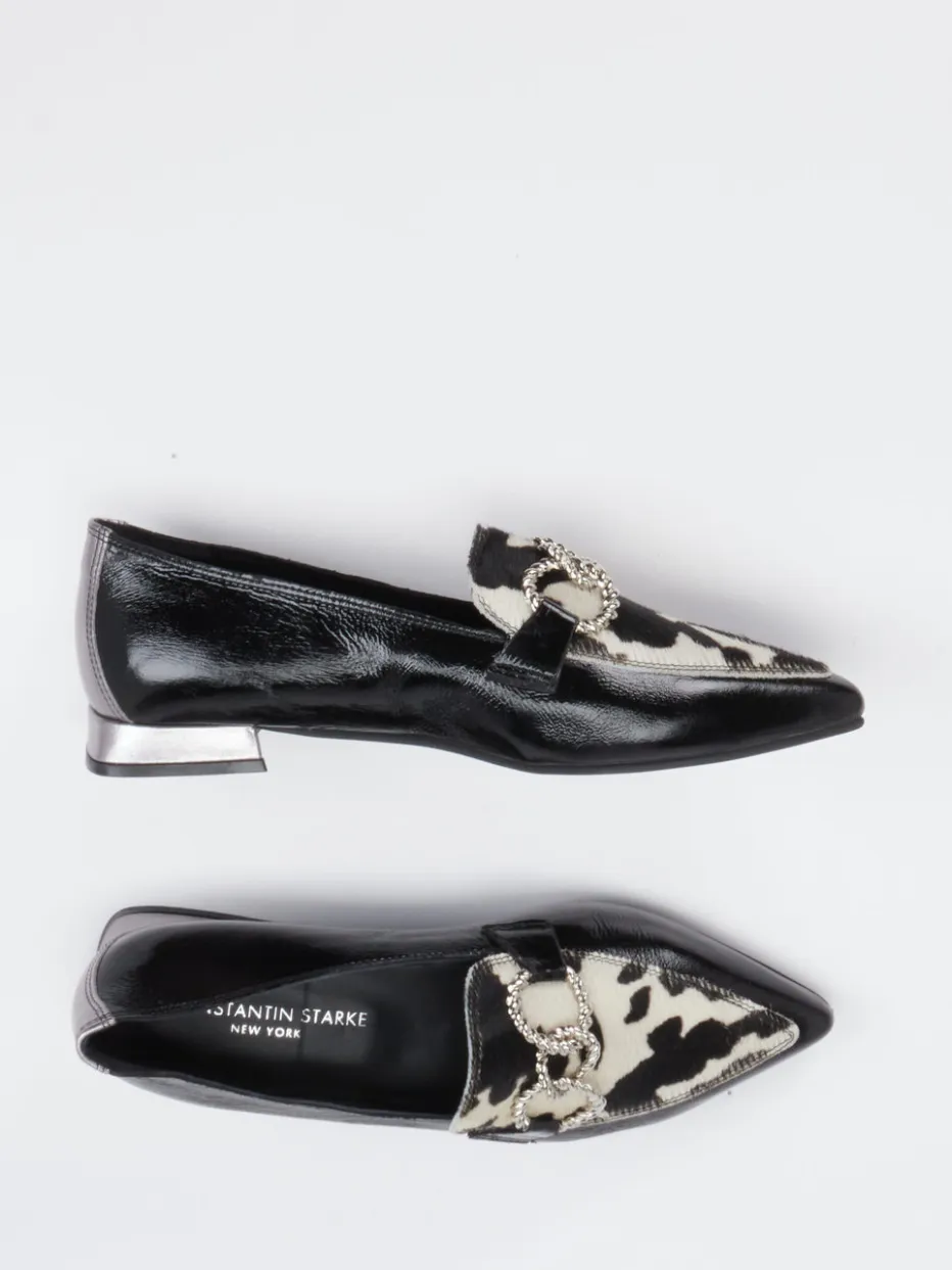 Eleganz trifft Struktur.Konstantin Starke interpretiert den klassischen Loafer für Damen neu. Dieses Modell verbindet glänzendes schwarzes Lackleder mit einem markanten Animalprint-Einsatz aus samtigem Ponyfell. Die spitz zulaufende Form wirkt modern und raffiniert, während Details wie eine silberfarbene Zierkette und ein metallicglänzender Fersenbesatz das Design aufwerten. Die dezent profilierte Gummisohle bietet Alltagstauglichkeit, das Lederfutter sorgt für Komfort. Eine perfekte Fusion aus Streetstyle-Einflüssen und minimalistischem Chic. Ein Statement-Schuh für charakterstarke Looks mit urbaner Eleganz.