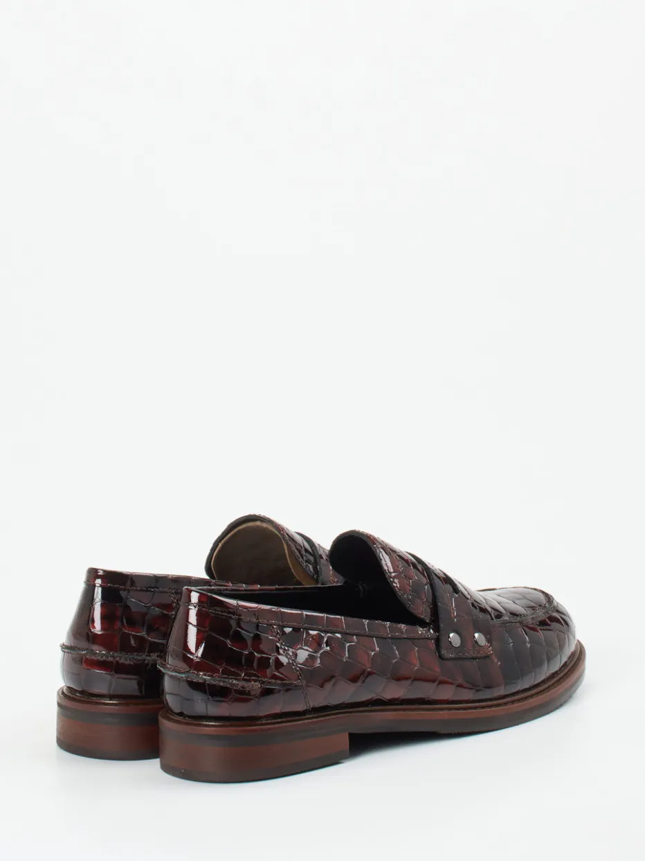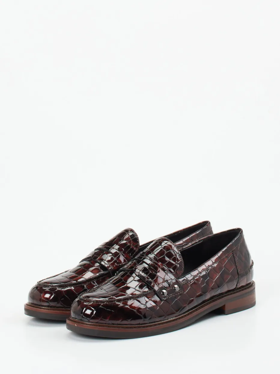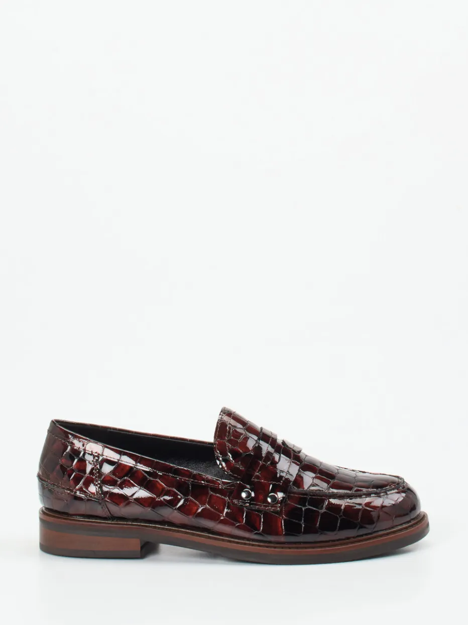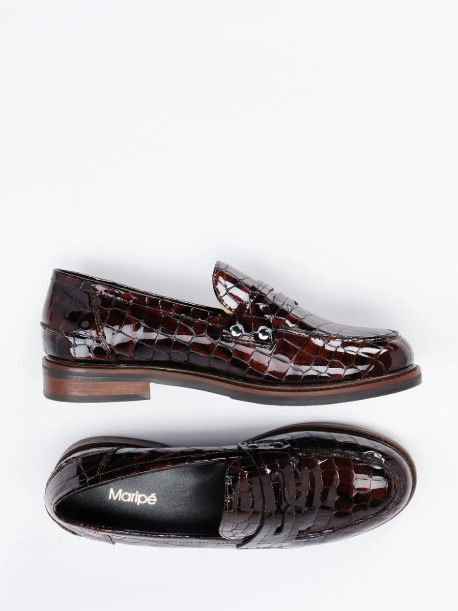 Edler Blickfang in glänzendem Design.Maripé präsentiert einen anspruchsvollen Damen-Loafer, der klassische Linien mit markanter Reptil-Optik vereint. Für stilvolle Office-Settings oder urbane Alltagsszenarien bietet dieser Slipper aus geprägtem und glänzendem Lackleder in Dunkelbraun eine ausdrucksstarke Grundlage. Die Krokoprägung, eine Ziernaht am Vorfuß und der Spannriegel bringen dezente Retro-Anleihen ins Spiel. Silberfarbene Nieten fügen ein modernes Finish hinzu, während die profilierte Gummisohle Sicherheit im Schritt gewährleistet. Die flache Form und der schimmernde Look harmonieren mit Heritage-Einflüssen wie dem „Quiet Luxury“-Trend. Zeitlose Eleganz trifft auf handwerkliche Präzision – typisch Maripé.