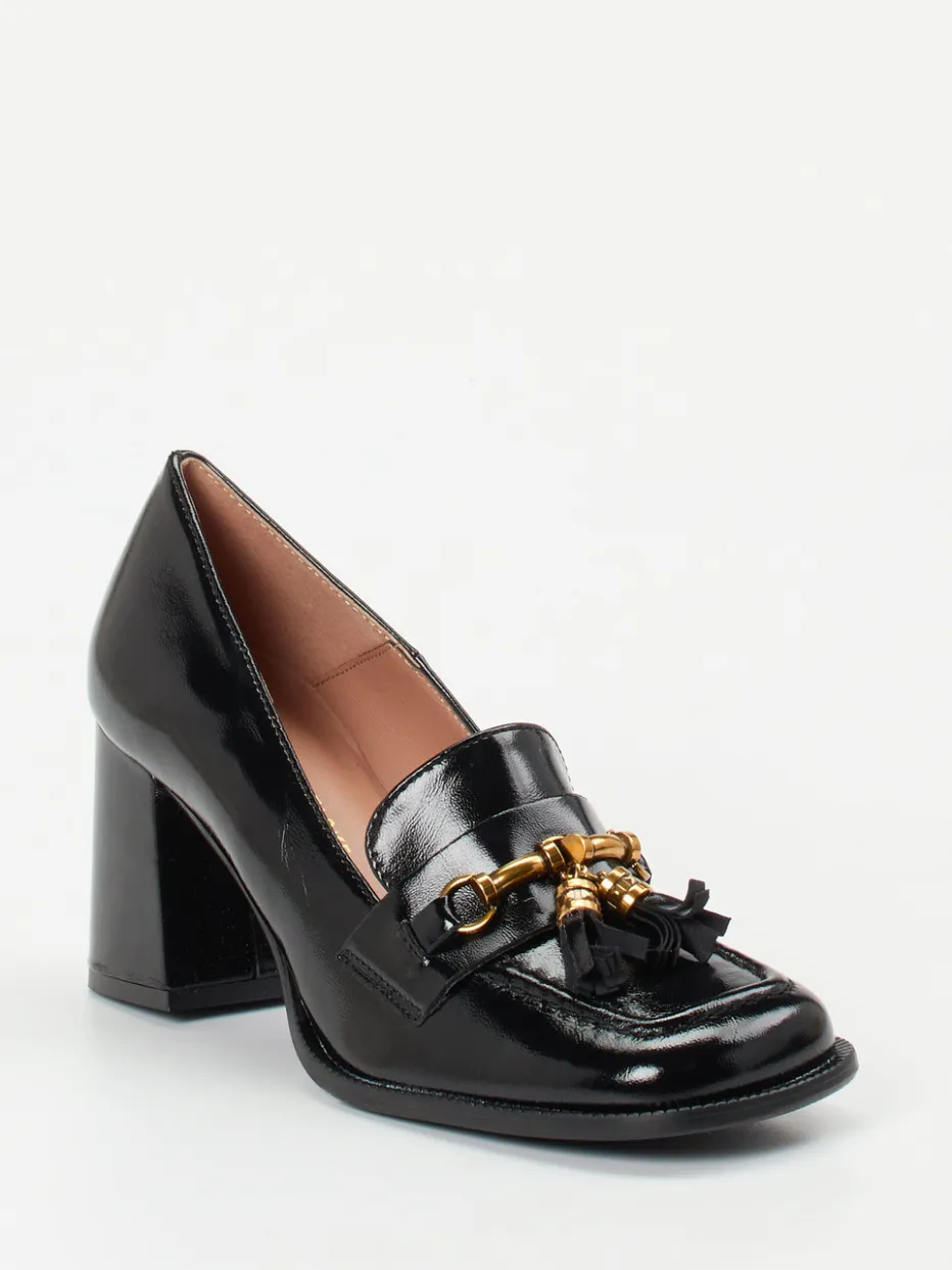Eleganz mit Retro-Flair.Konstantin Starke präsentiert einen Damen-Loafer für Herbst/Winter, der klassischen Stil mit modischer Raffinesse kombiniert. Für den idealen Auftritt im Büro oder bei abendlichen Events bietet der Loafer aus schwarzem Lackleder, samtig glänzend, eine stilvolle Lösung. Die klassische Silhouette mit kräftigem Blockabsatz sorgt für sicheren Stand, unterstützt durch eine strukturierte Gummisohle. Goldfarbene Zierschnalle mit Quasten setzt edle Akzente und unterstreicht den „Quiet Luxury“-Trend. Innen bietet Kalblederfutter mit gepolstertem Fußbett ein komfortables Tragegefühl. Optimal zu Business-Anzügen oder Lederhandtaschen. Ein stilbewusstes Statement mit hochwertiger Verarbeitung und zeitlosem Designanspruch.