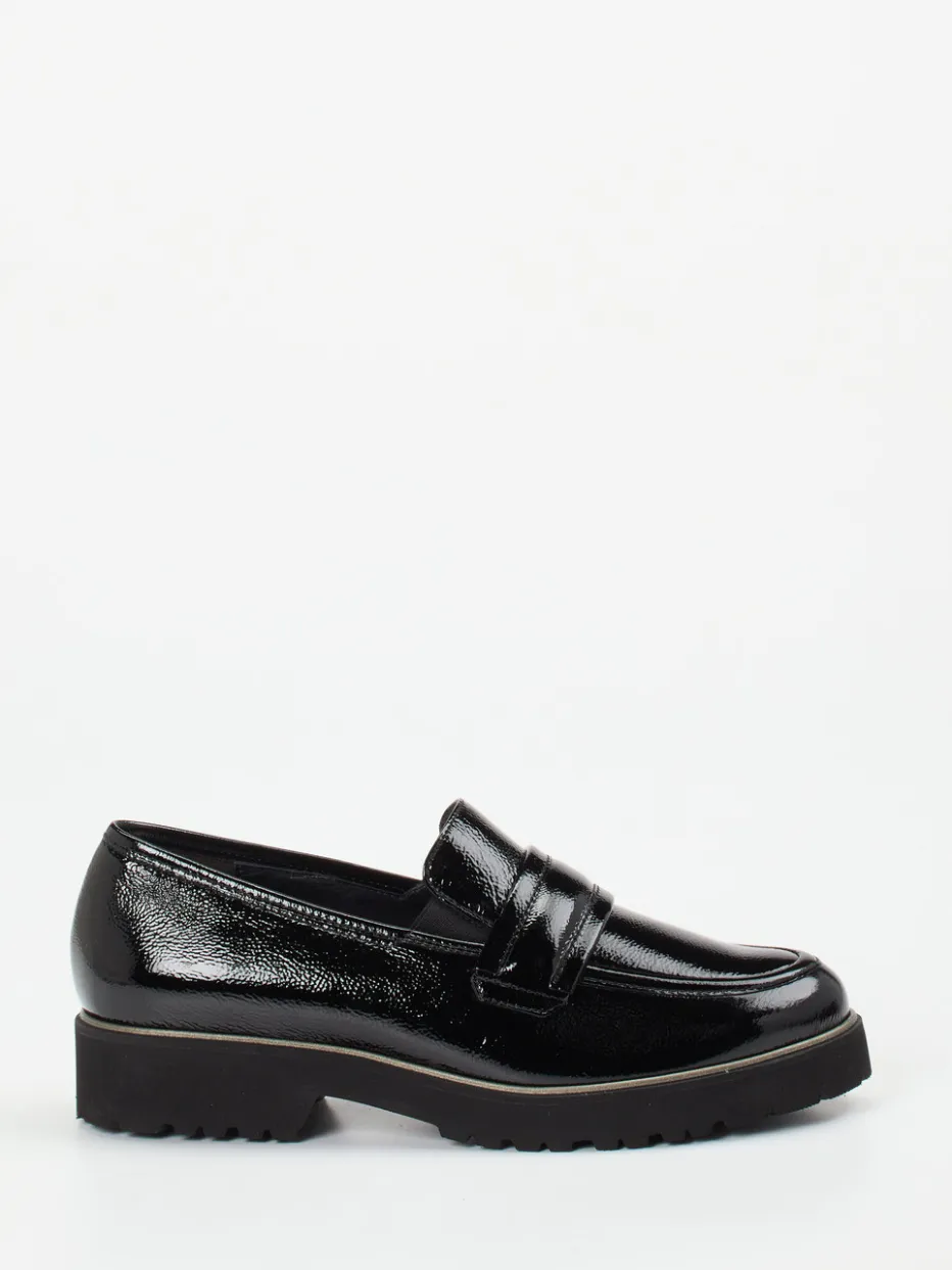 Ideal für den Büroalltag oder gehobene Freizeitlooks bietet dieser schwarze Loafer zuverlässige Bodenhaftung durch seine profilierte Laufsohle. Gefertigt aus hochwertigem Lackleder mit glänzender Oberfläche zeigt er sich formschön mit klassischer Silhouette und markanter Spange über der Zunge. Die dezente Kantenpaspelierung und Ton-in-Ton-Nähte verfeinern das Design. Inspiriert vom Chunky-Loafer-Trend und dennoch zurückhaltend im Stil, lässt sich dieses Modell vielseitig kombinieren – ob zu straight-leg Jeans oder Feinstrick.