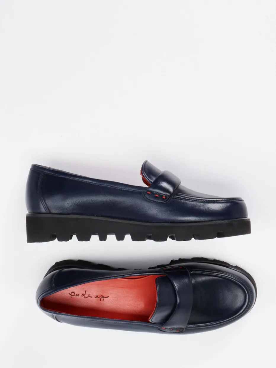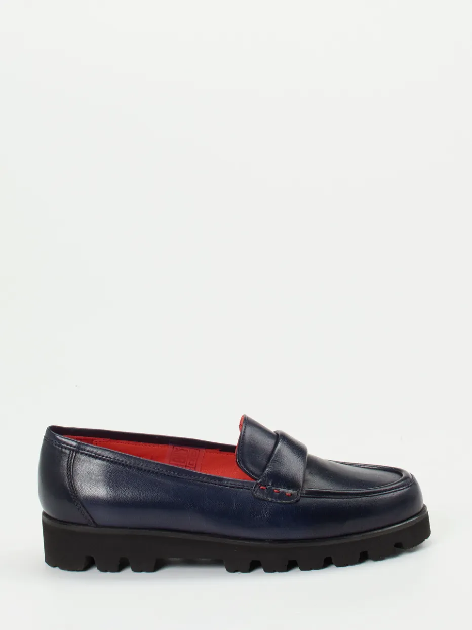 Klarer Auftritt mit subtiler Farbkraft.Pas de Rouge präsentiert einen Damen-Loafer, der klassisches Design mit streetwear-inspirierten Details verbindet. Für Business-Termine oder casual City-Walks bietet dieser Schuh dank des samtig weichen Lammleders in tiefem Dunkelblau überragenden Tragekomfort. Die glänzende Oberfläche harmoniert mit tonigen Nähten, während ein markanter Zungenriegel und das korallenrote Lederfutter mit Velourslederpatch Kontraste setzen. Die profilierte Leichtzellsohle verleiht Volumen und sorgt für Trittsicherheit – passend zum Chunky-Trend der Saison. Ideal kombinierbar mit Statement-Socken oder minimalistischen Business-Looks. Markentypisch ausgewogen: Stil, Funktion und Komfort auf einem raffinierten Niveau.