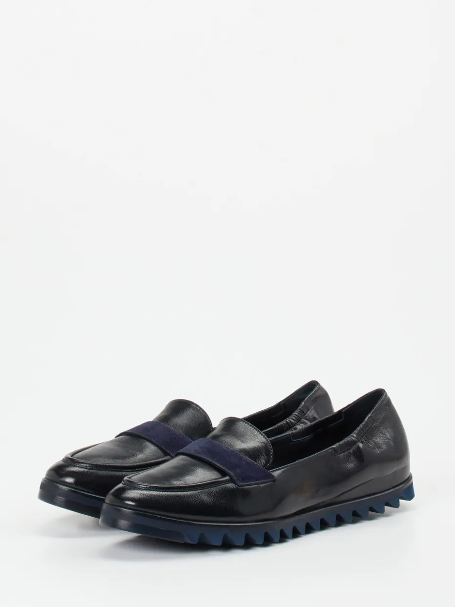 Stilvoll durch Alltag und Büro.Dieser Damen-Loafer von Konstantin Starke überzeugt als modischer Begleiter mit Anspruch an Qualität und Minimalismus. Handschuhweiches Lammleder mit glänzender Oberfläche verleiht ihm einen edlen Charakter, während das marinefarbene Veloursdetail auf dem Spann als dezenter Kontrast wirkt. Die klassische Silhouette wird durch eine flexible Gummisohle mit tiefem Zahnprofil ergänzt, das sicheren Halt und sanftes Abrollen garantiert. Der elastische Einsatz an der Ferse erleichtert den Einstieg und sorgt für hohen Tragekomfort. Der Mix aus zurückhaltendem Design und funktionalen Details unterstützt den „Quiet Luxury“-Look und passt ideal zu klar geschnittenen Bürooutfits oder hochwertigen Casual-Kombinationen. Maximaler Komfort trifft moderne Linienführung mit zurückhaltender Markenästhetik.