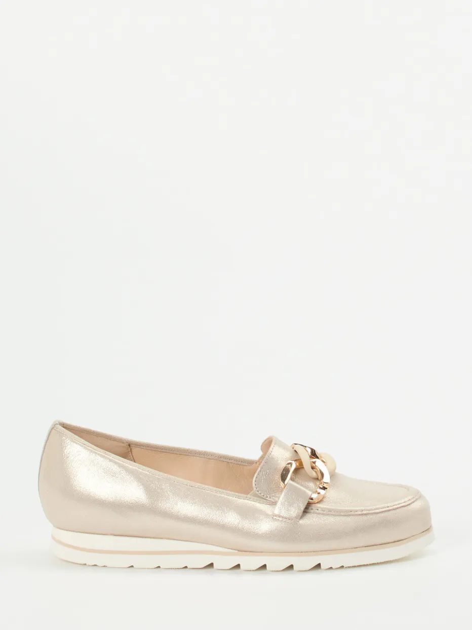 Als Schlupfschuh gefertigt, überzeugt dieses Modell mit champagner-beigem Metallicleder, das für edlen Glanz sorgt. Die klassisch flache Silhouette wird durch eine gold- und cremefarbene Gliederkette stilvoll akzentuiert. Eine profilierte, weiße Gummisohle mit leichtem Keilabsatz bietet stoßdämpfenden Komfort – auch für eigene Einlagen geeignet. Geprägt von Minimalismus und Quiet Luxury spiegelt der Schuh aktuelle Trends wie Metallic Accents und Chunky Chains wider. Besonders harmonisch wirkt er zu beigem Blazer oder heller Ledertasche.