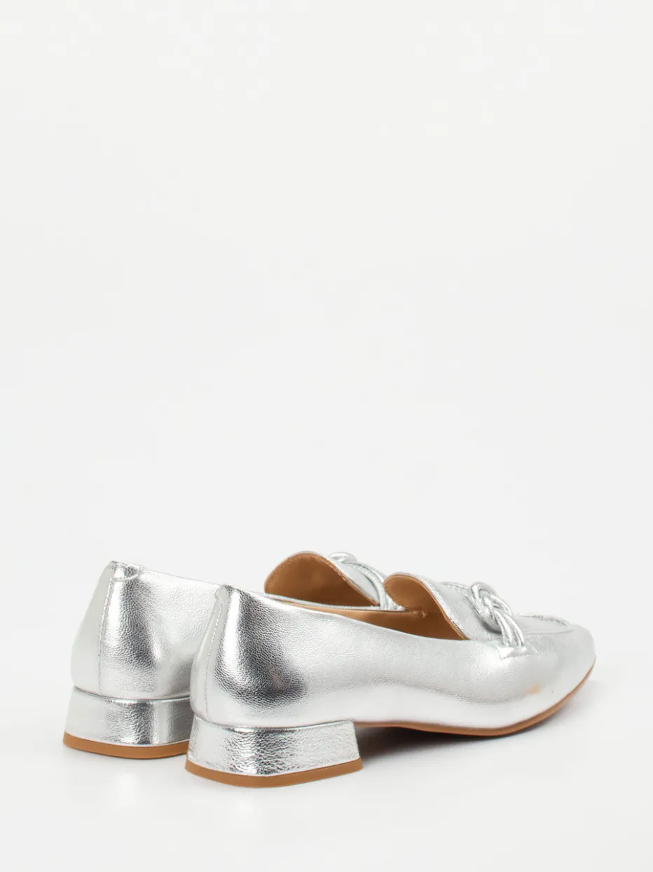 Ob im Office oder bei stilvollen City-Outfits – dieser Loafer überzeugt mit glänzendem Metallicleder, klassisch-spitz zulaufender Form und einem dekorativen Zierknoten über dem Spann. Den 90s-inspirierten Charakter unterstreichen Ton-in-Ton-Nähte und ein bezogener Blockabsatz mit komfortabler Laufhöhe. Die minimalistische Linienführung trifft auf einen trendstarken Metallic-Look und erfüllt den Anspruch moderner Quiet Luxury-Ästhetik. Ein angenehm weiches Lederfutter rundet den Tragekomfort ab. Stilvoll zu kombinieren mit einer Stoffhose oder Midirock.