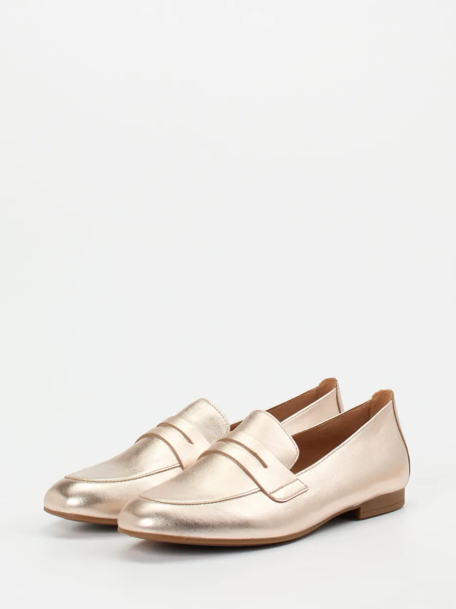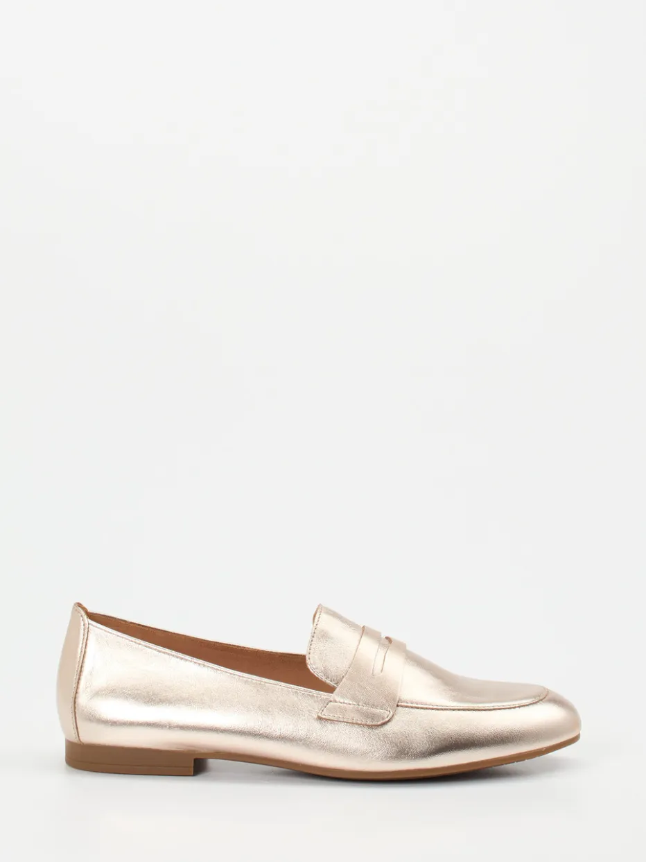 Gabor präsentiert einen eleganten Damen-Loafer, gefertigt aus hochwertigem Metallicleder in zartem Roségold.