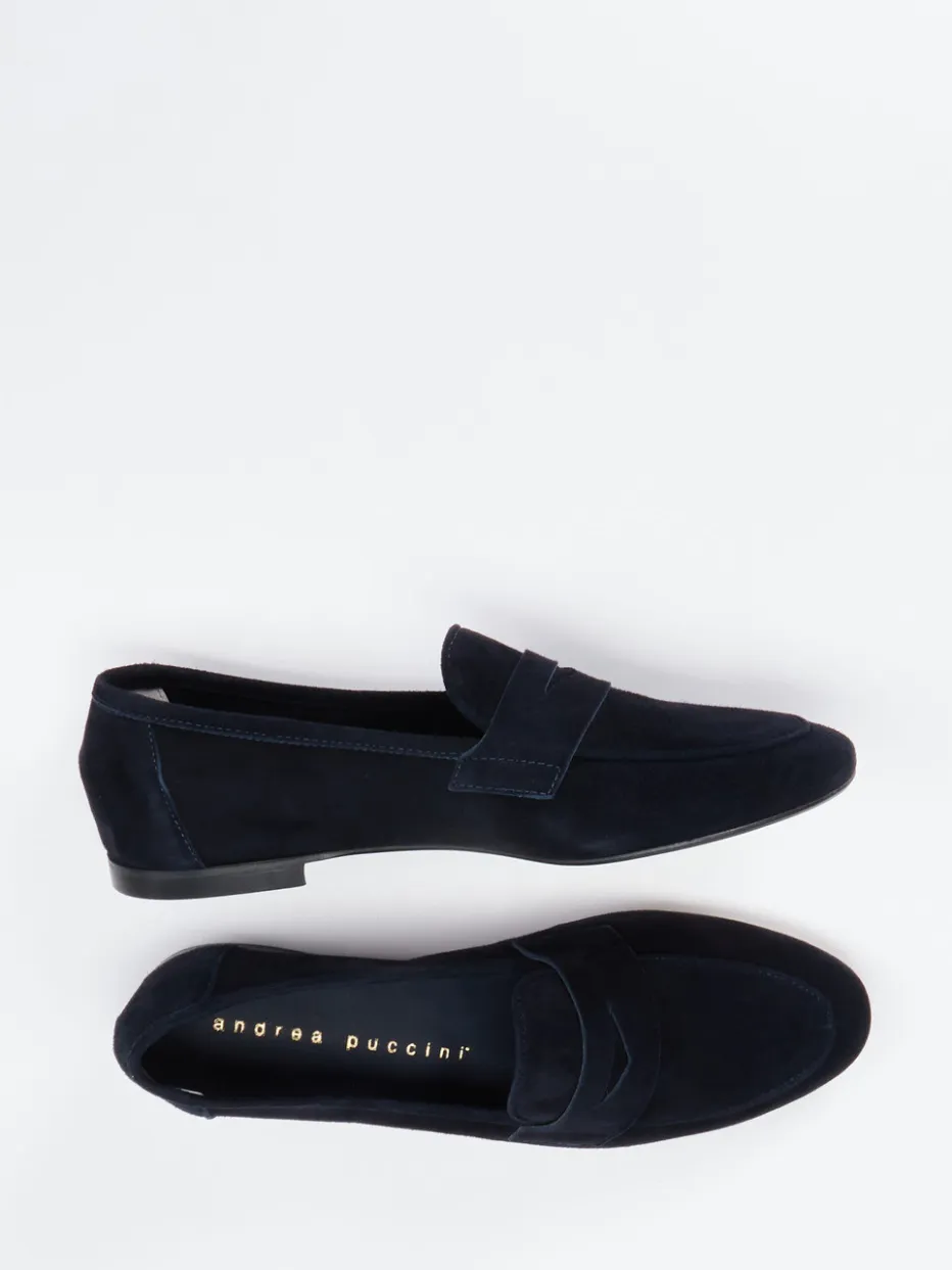 Minimalistisch trifft edel.Die Marke Andrea Puccini präsentiert einen klassischen Damen-Loafer aus hochwertigem Veloursleder. Ob für den Business-Alltag oder den gehobenen Freizeit-Look – dieser Slipper in edlem Dunkelblau begleitet anspruchsvolle Garderoben stilvoll. Das matt strukturierte Veloursleder, ergänzt durch tonale Ziernähte und eine dezent gestaltete Zierlasche, betont das reduzierte Design. Die flache Silhouette mit leichtem Blockabsatz und hochwertiger Kunststoffsohle sorgt für Komfort und Eleganz. Der Loafer fügt sich mühelos in den Trend „Quiet Luxury“ ein und passt ideal zu Business-Hosen oder monochromen Styles. Stilvolle Zurückhaltung mit italienischem Feingefühl.