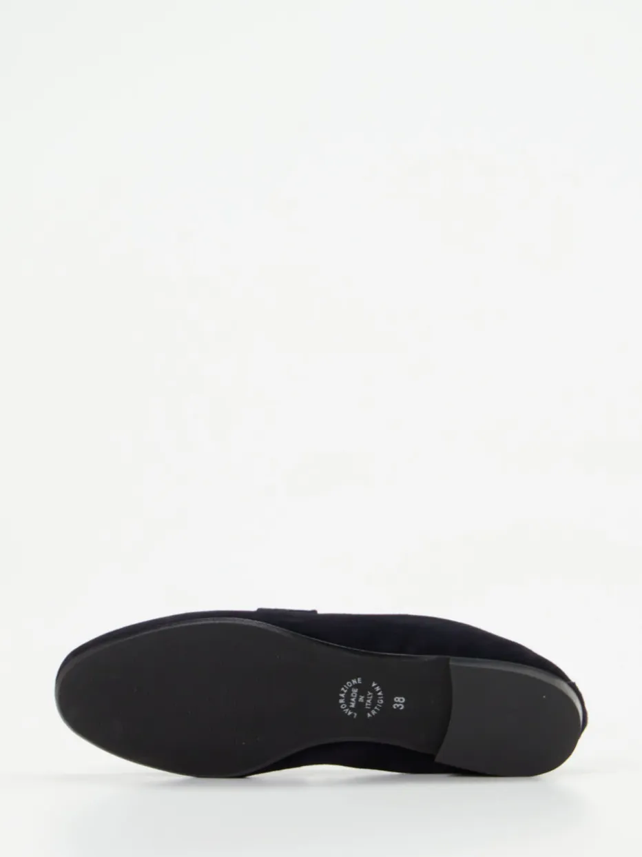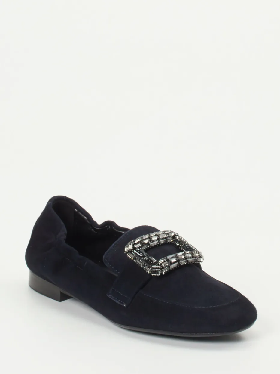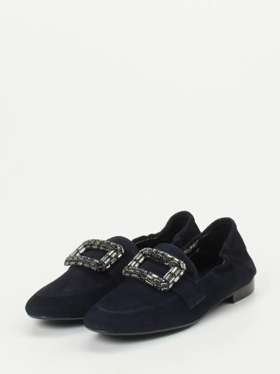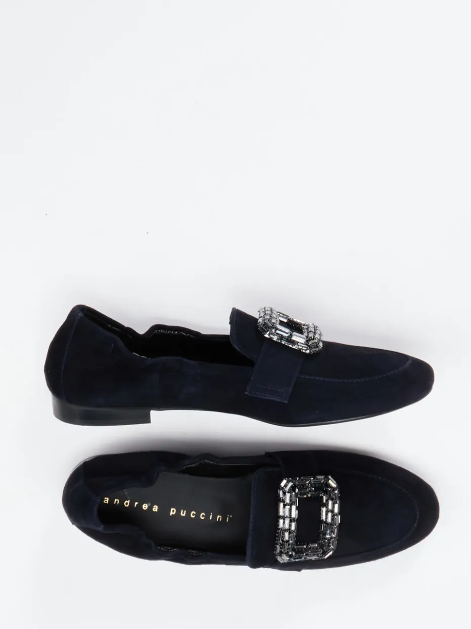 Der Loafer von Andrea Puccini besticht durch edles Veloursleder und eine funkelnde Strassschnalle – ein stilvoller Akzent für elegante Looks.
