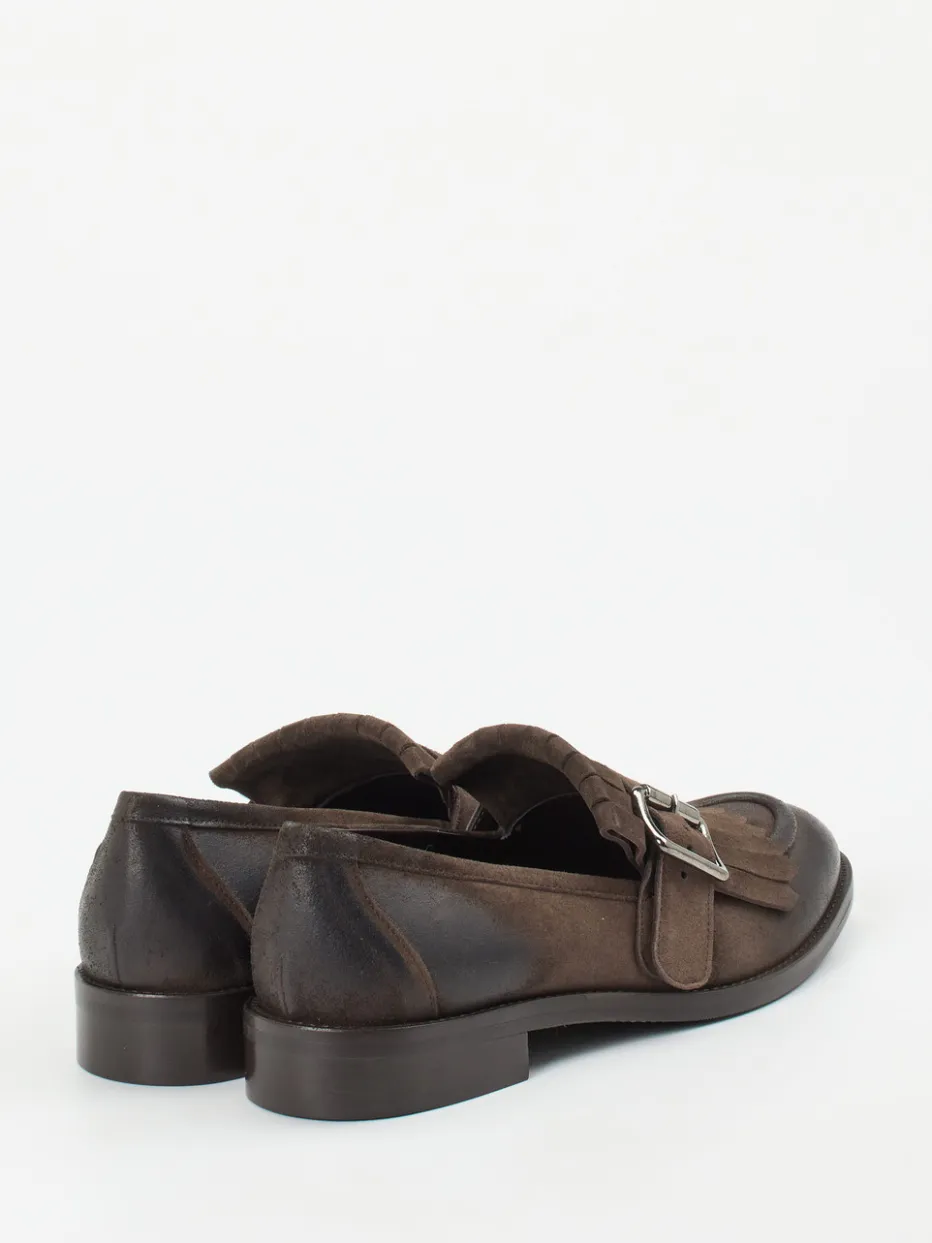 Tradition trifft Heritage-Update.Konstantin Starke präsentiert einen Damen-Loafer mit stilvoller Fransenlasche und markanter Schnalle. Ob im Büro zum Wollanzug oder beim Stadtbummel mit Strickpullover – dieser Schlupfschuh vereint Eleganz und Komfort. Aus hochwertigem Veloursleder gefertigt, zeigt das Modell samtige Flächen mit sanftem Glanz, vor allem an Zehen- und Fersenkappe im Vintage-Finish. Dunkelbraun dominiert das Design und wird durch eine breite, silberfarbene Zierschnalle akzentuiert. Die flache Silhouette, gepaart mit einer rahmengenähten Gummisohle, unterstreicht die zeitlose Linie. Heritage-Elemente und moderne Zurückhaltung machen ihn zum ruhigen Luxusstück. Stilbewusste Linienführung für anspruchsvolle Lieblingslooks.