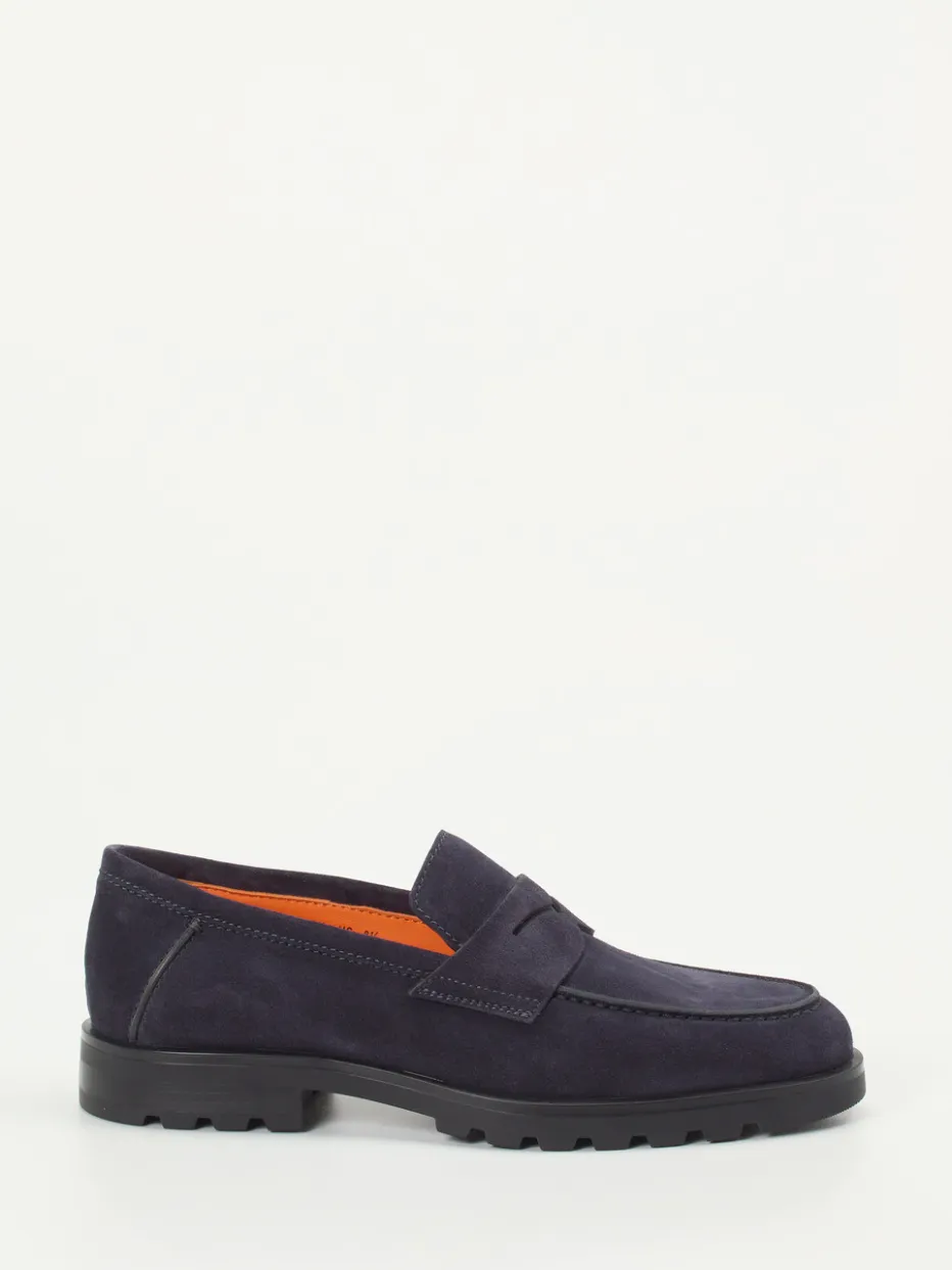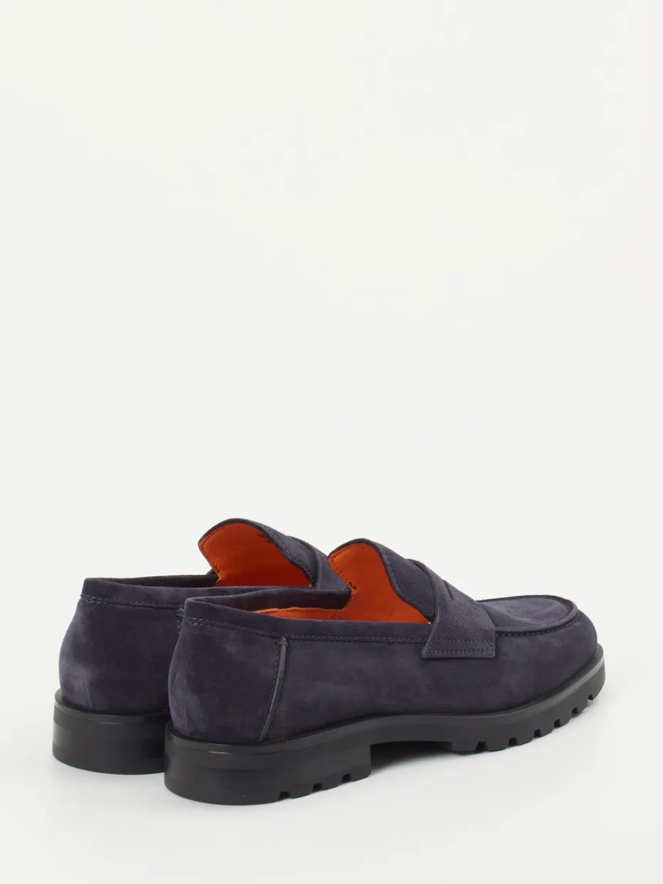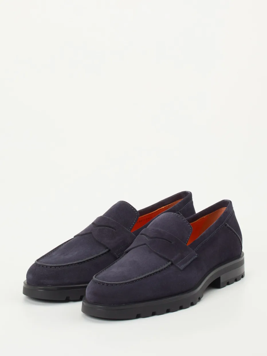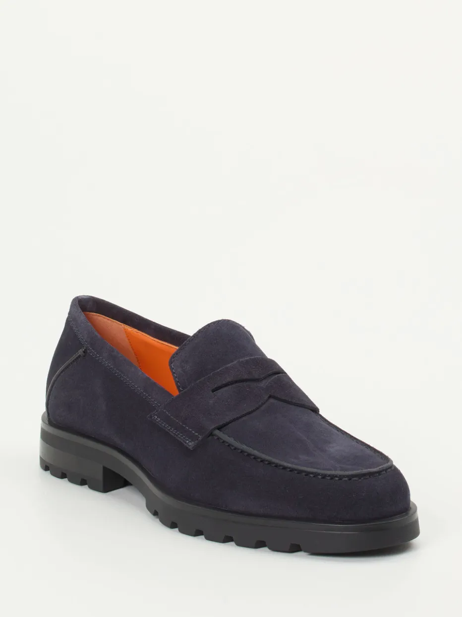 Fein verarbeitetes Veloursleder und ein klassischer Penny-Steg machen diesen Loafer von Santoni zu einem stilvollen Begleiter für stilbewusste Herren.