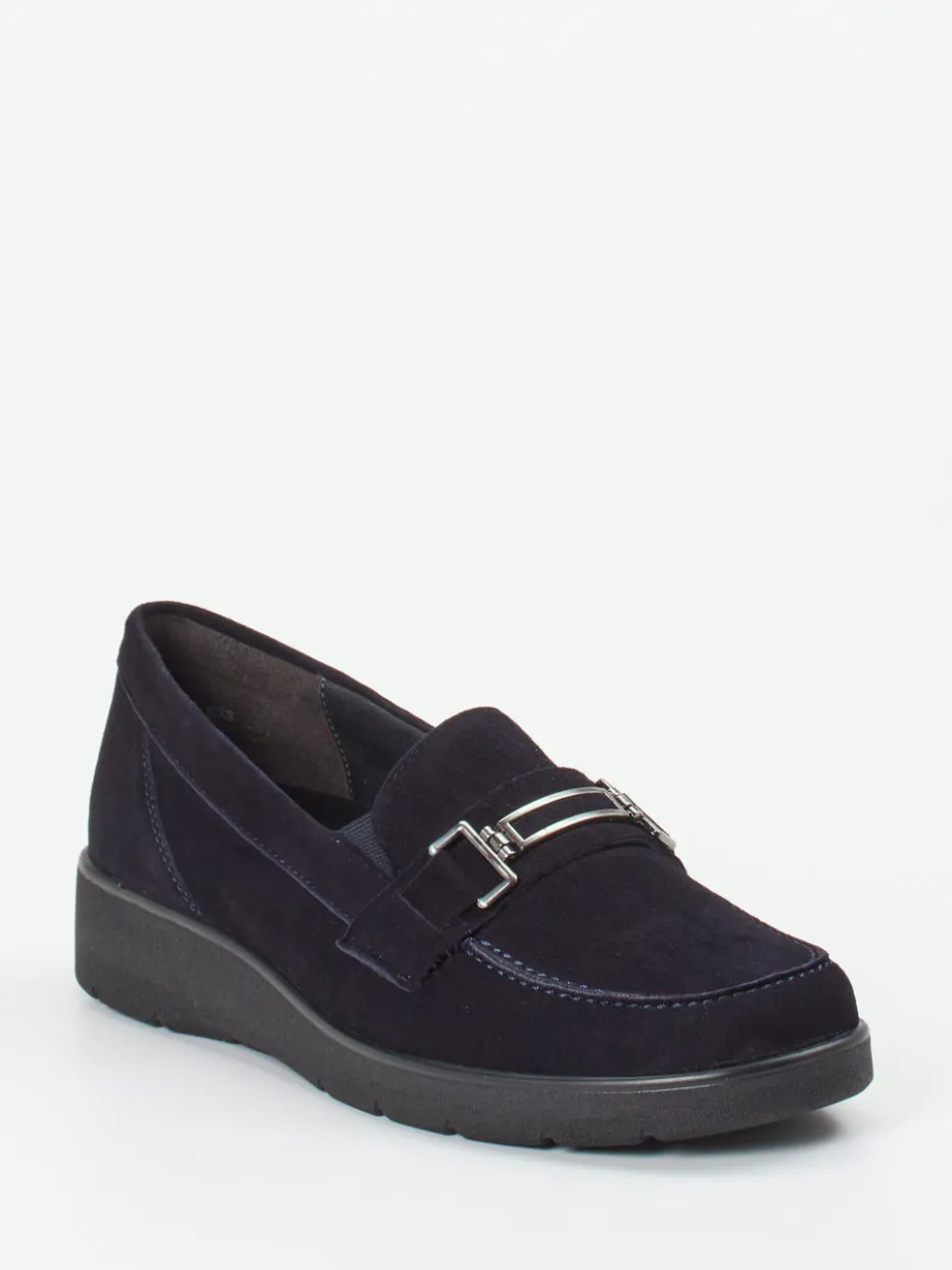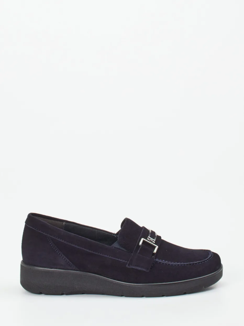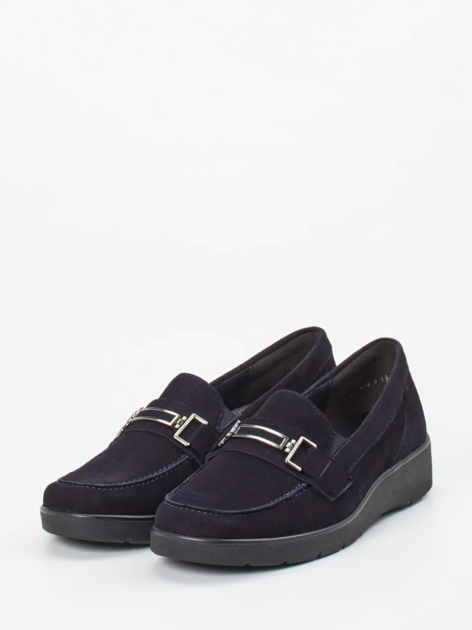Eleganz trifft Komfort.Der Damen-Loafer von Semler überzeugt als stilvolle Lösung für lange Büro- oder Alltagstage. Gefertigt aus samtig angeschliffenem Veloursleder in tiefem Dunkelblau, bietet dieser Schlupfschuh eine edle Kombination aus Minimalismus und Funktion. Die klassische, flache Silhouette wird durch eine silberfarbene Trensenspange auf dem Vorderblatt aufgewertet. Die Komfortsohle mit ergonomischer Leichtzellsohle sorgt für angenehme Dämpfung, während elastische Einsätze das An- und Ausziehen erleichtern. Dank der Weite H ist er ideal für breitere Füße. Im „Quiet Luxury“-Look lässt er sich vielseitig zu Business- oder Casual-Styles tragen. Semler steht für bequeme Passformen mit anspruchsvollem Design.