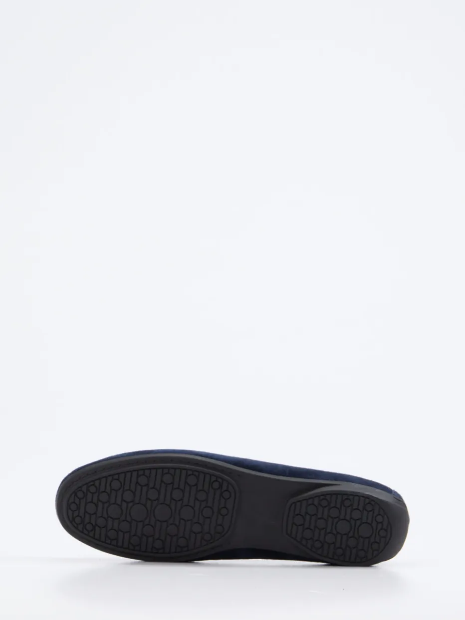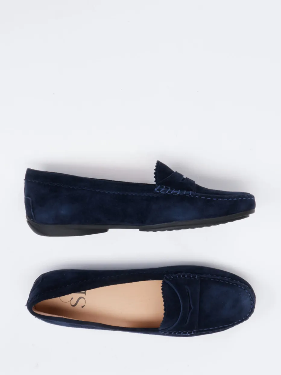 Minimalismus mit Understatement.Si präsentiert einen stilvollen Damen-Loafer aus edlem Veloursleder. Für Tage, an denen komfortabler Chic gefragt ist: Der navyfarbene Loafer aus samtig-mattem Veloursleder begeistert mit klassischer Mokassin-Naht, gezacktem Schaftabschluss und markantem Pennyschlitz. Eine robust profilierte Gummisohle sorgt gemeinsam mit einem angenehm weichen Lammnappa-Futter in Nude für spürbaren Tragekomfort im Alltag und Büro. Die flache Schlupfform wirkt dezent und feminin zugleich – perfekt im Kontext von „Quiet Luxury“ und minimalistischen Looks. Ideal zu hellen Chinos oder edlem Denim. Ein vielseitiger Begleiter mit hochwertiger Verarbeitung und kultivierter Formsprache.