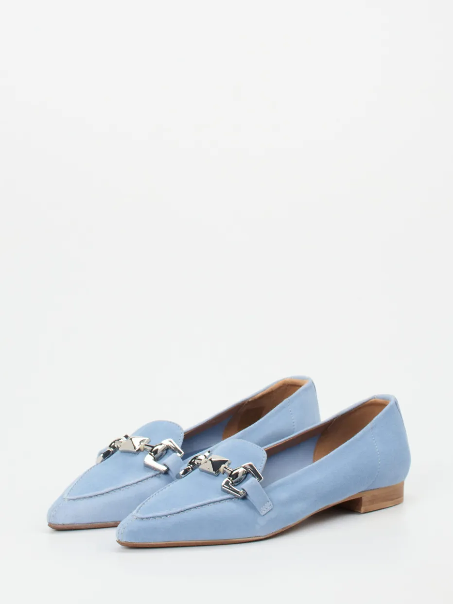 Wenn gepflegte Alltagslooks oder Business-Casual-Outfits verlangt sind, überzeugt dieses Modell mit seinem hellblauen, samtig mattierten Veloursleder. Die spitze Leistenform wirkt feminin und modern zugleich, während die silberfarbene Zierkette im Pyramidennieten-Stil als markanter Akzent hervorsticht. Die Mokassinnaht verleiht handwerkliche Raffinesse, das ungefütterte Design sowie das weiche Ziegenleder-Fußbett erhöhen den Komfort. Die flache Gummisohle und der leichte Blockabsatz runden das Preppy-Chic-Design funktional ab. Kombinationsempfehlung: ideal zu Stoffhose oder Ledertasche in hellen Tönen.