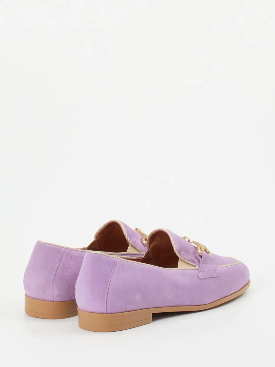 Der klassische Damen-Loafer verbindet weiches Veloursleder mit edlen Details und liegt mit zartem Fliederton ganz im Trend der Saison. Ideal für stilbewusste Alltags-Looks zwischen Minimalismus und Raffinesse.