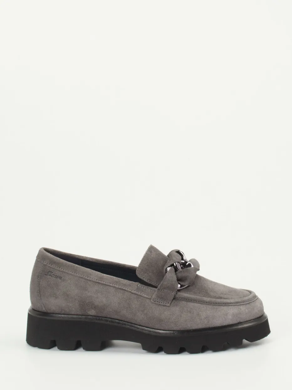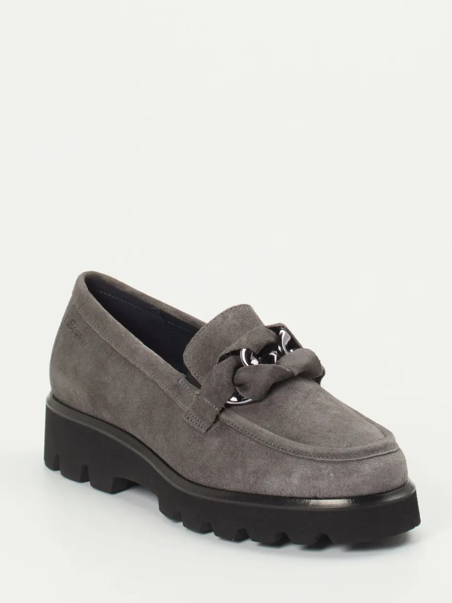 Der klassische Damen-Loafer von Sioux kombiniert weiches Veloursleder in Silbergrau mit einer markanten Profilsohle und metallischem Kettendetail – modisch, komfortabel und bürotauglich.
