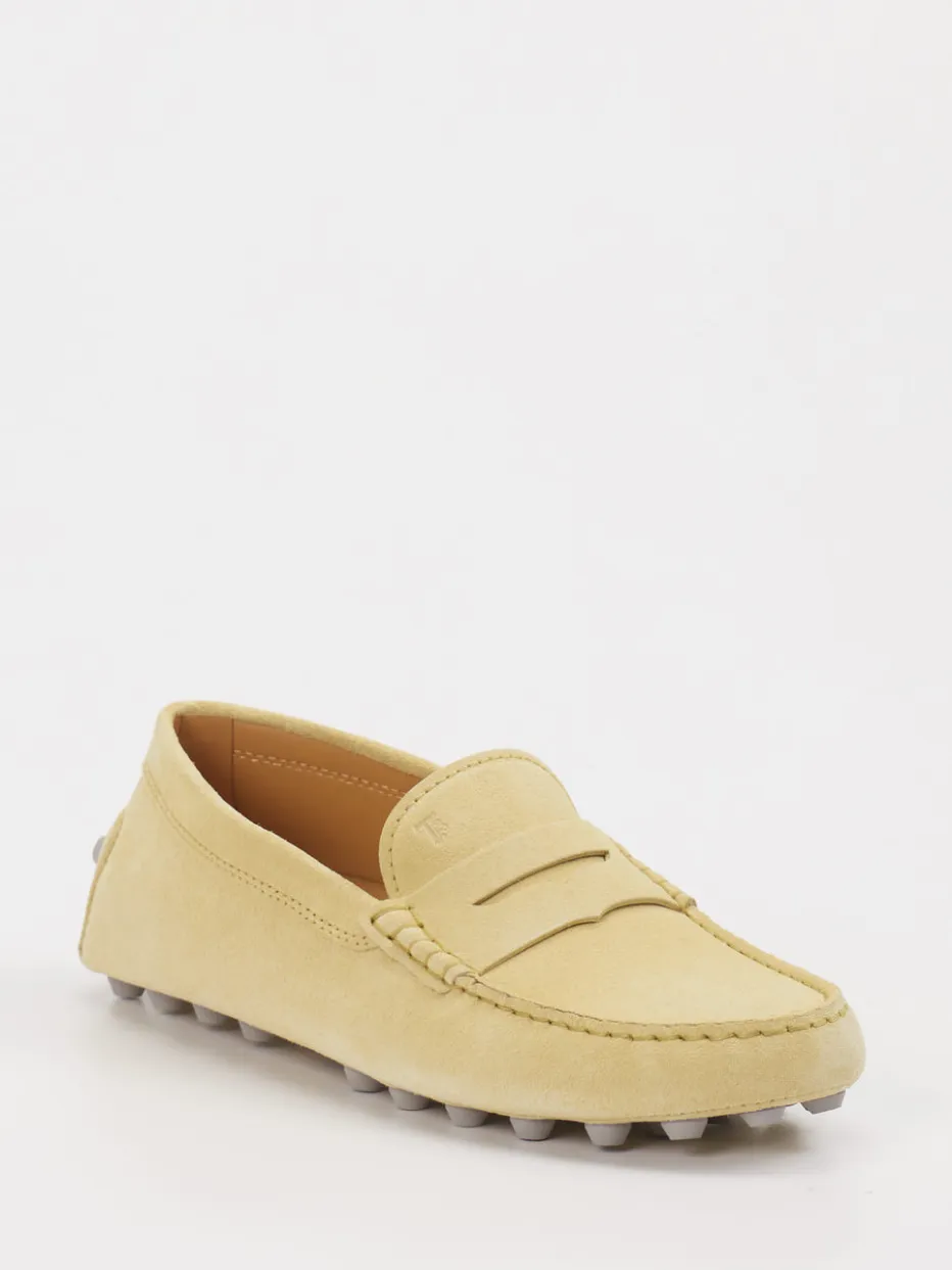 Mit seinem hochwertigen Veloursleder und der glatten, matten Oberfläche fügt sich das Modell nahtlos in minimalistische Sommerlooks ein. Das helle Gelb unterstreicht die cleane Silhouette mit Mokassin-Naht und geprägtem Logo auf dem Blatt. Für angenehmen Halt sorgt die griffige Gummisohle mit charakteristischer Noppenstruktur. Die schlupfbare Form erhöht den Komfort, während klassische Linienführung und dezentes Design dem „Quiet Luxury“-Look folgen. Ideal zu Leinenhosen oder tonalen Outfits.