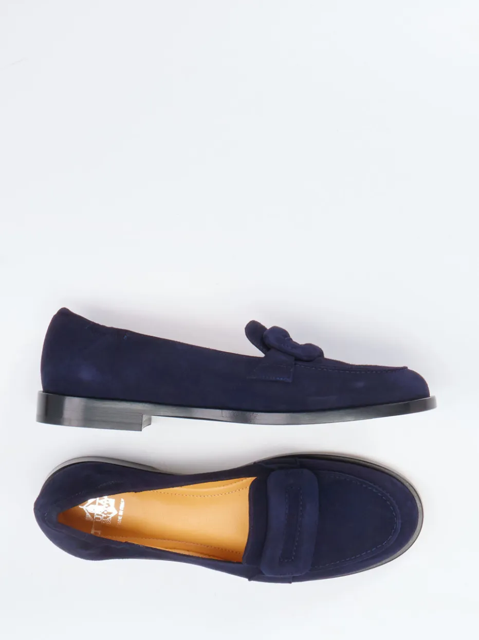 Ob im Office oder beim Stadtbummel – das samtig-matte Veloursleder in Marineblau verbindet hochwertigen Look mit dezenter Aussagekraft. Ein tonaler Zierschlaufenakzent und die markante Mokassinnaht unterstreichen den zeitlosen Charakter. Die flache Silhouette und das cognacfarbene Innenfutter aus Lammnappa schaffen Komfort und Raffinesse. Die halb gummierte Ledersohle sorgt für sicheren Stand und urbanen Stil. Ideal für schlichte Kombinationen mit Blazer oder Culotte.