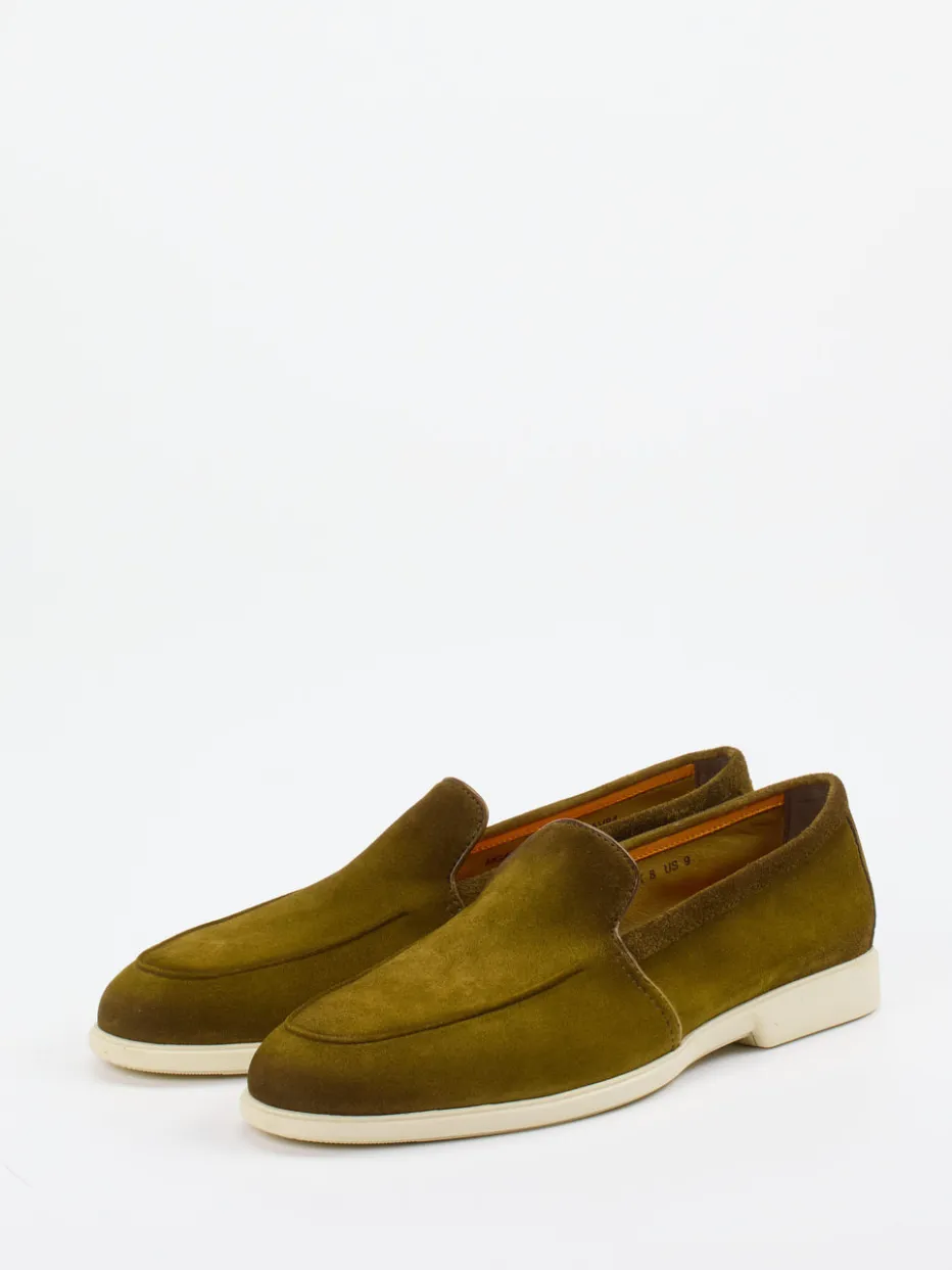 Santoni interpretiert den Herren-Loafer mit klassischer Schlupfform und olivgrünem Veloursleder in sommerlich-leichter Ausführung.
