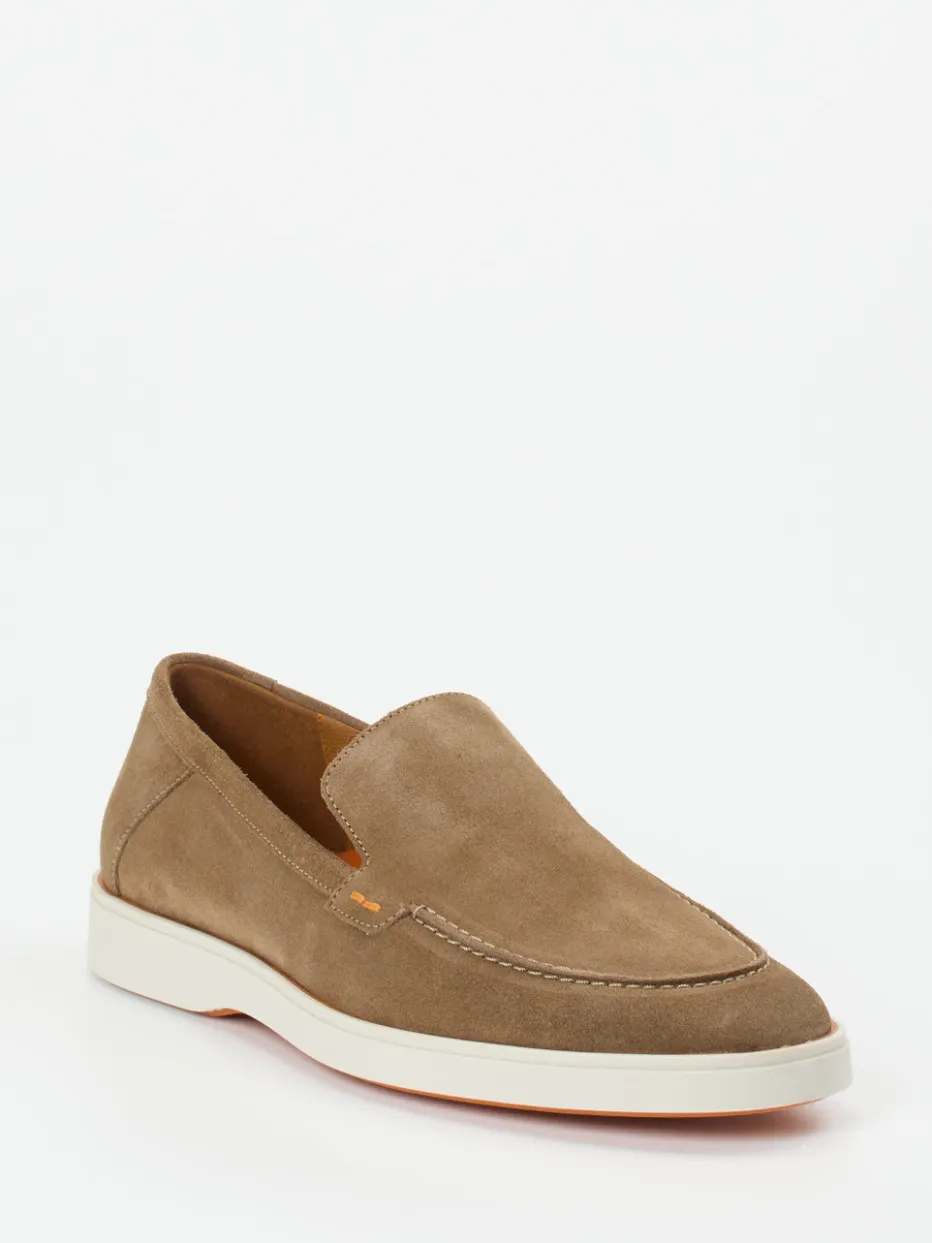 Sommerlich smarter Auftritt.Lloyd präsentiert mit diesem Herren-Loafer ein Modell, das dezente Eleganz mit modernem Komfort vereint. Ob beim After-Work oder im kreativen Büroalltag – das sandbeige Veloursleder wirkt matt und samtig, während die offwhitefarbene Gummisohle mit orangefarbenem Rahmen und Kompass-Prägung für frische Akzente sorgt. Die klassische, flache Silhouette mit seitlichen Elastikeinsätzen unterstreicht den minimalistischen Charakter. Das weiche Kalblederfutter bietet spürbaren Tragekomfort. Der Look orientiert sich an „Quiet Luxury“ und liegt mit seinen soften Neutraltönen voll im Trend. Ein vielseitiger Begleiter für entspannte, stilvolle Sommermomente.
