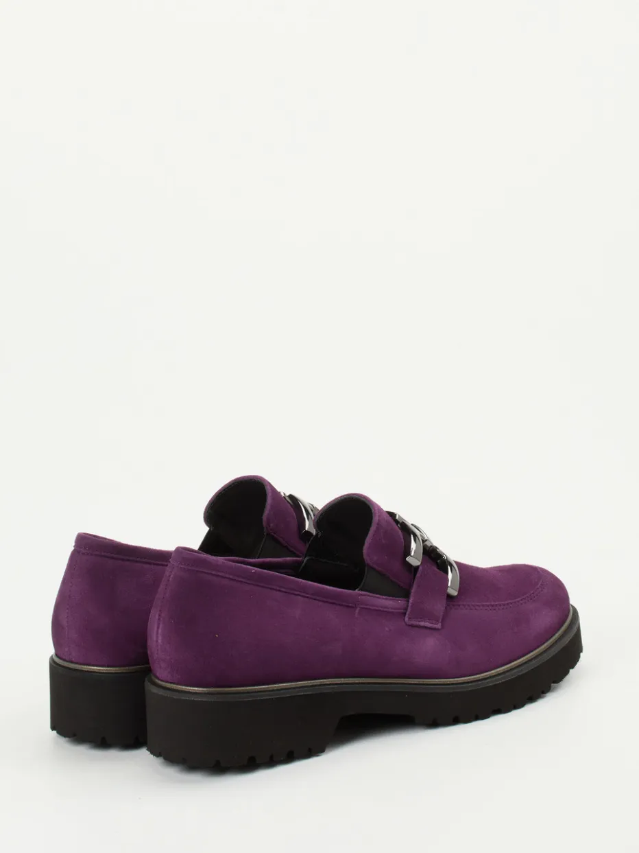 Trendkompetenz trifft Komfort.Semler präsentiert einen Loafer für Damen, gefertigt aus hochwertigem Veloursleder mit samtig-matter Oberfläche. Die violette Farbgebung in Verbindung mit der klassischen Form und einer silberfarbenen Kettenschnalle setzt ein modisches Statement. Die breite Frontpartie, das gepolsterte, wechselbare Fußbett sowie die profilierte Gummisohle sorgen für bequemen Halt bei jedem Schritt – ob im Büro oder in der City. Der modische „Chunky Loafer“-Look spiegelt den aktuellen Streetwear-Trend wider und lässt sich ideal zu Oversized-Blazern oder schmalen Hosen kombinieren. Ein ausdrucksstarker Begleiter für trendorientierte Komfortliebhaberinnen mit Anspruch.