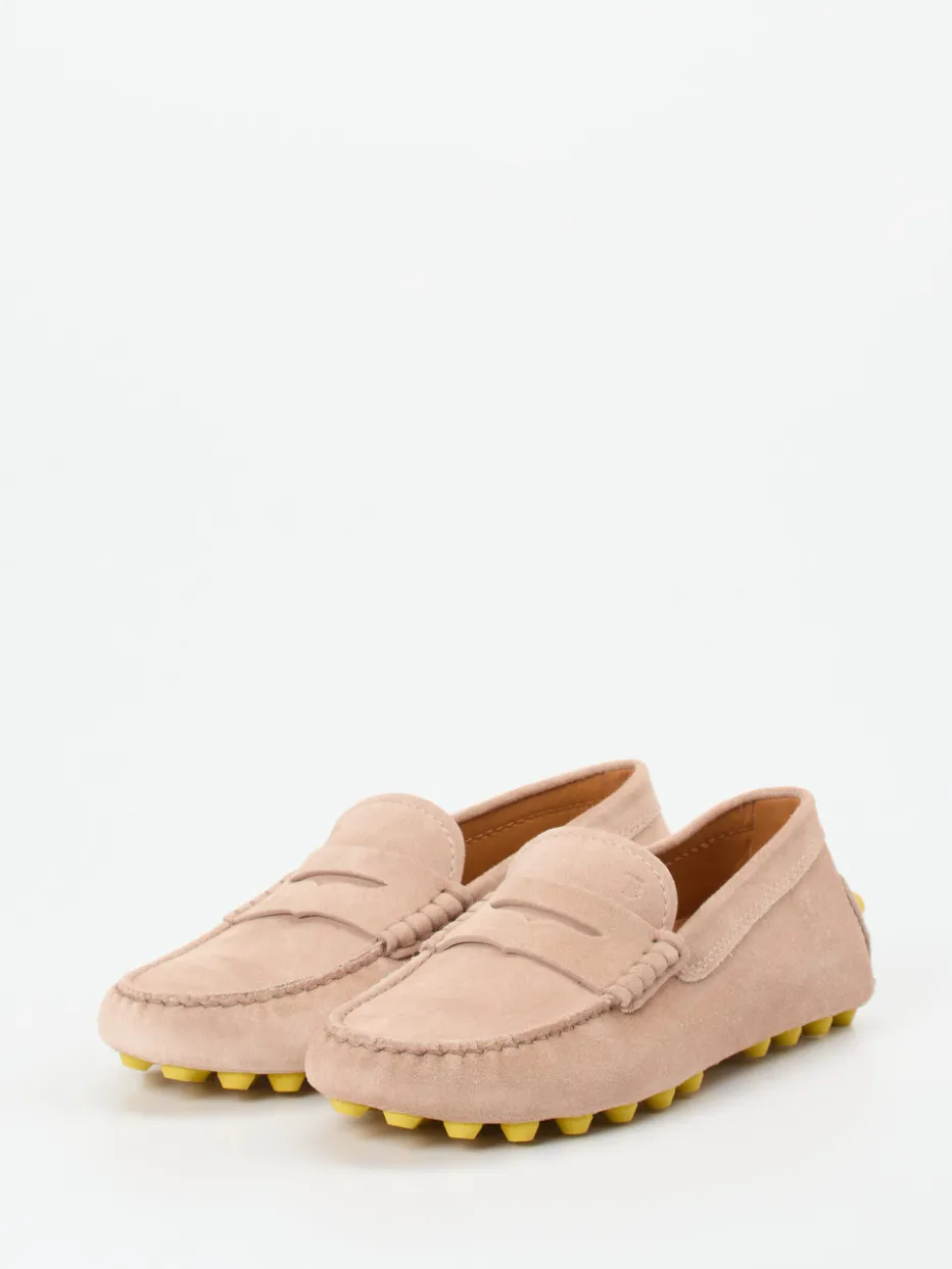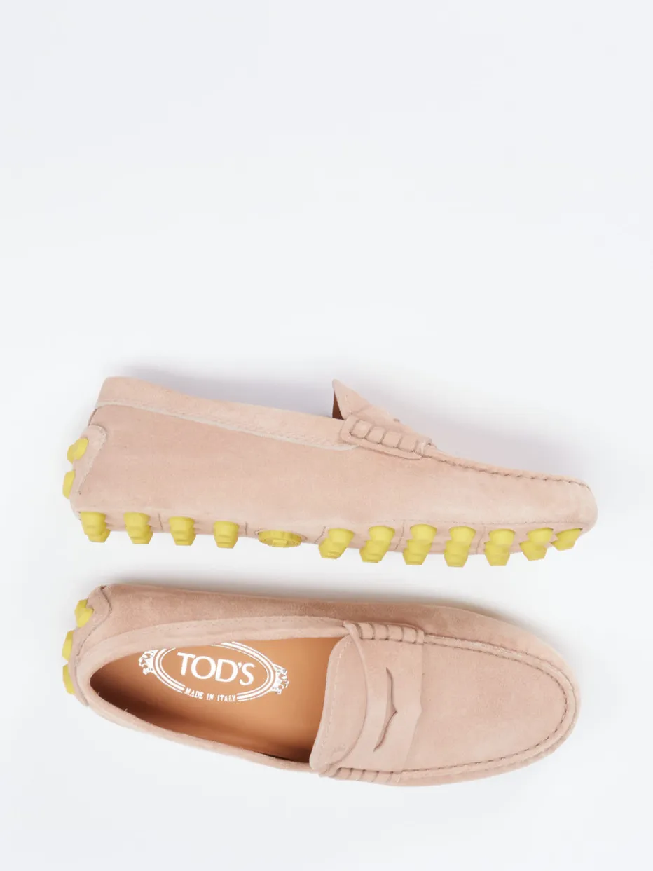 Kontrast aus Eleganz und Komfort.Tod’s präsentiert einen sommerlichen Loafer für Damen, gefertigt aus hochwertigem Veloursleder. Ideal für warme Tage in der Stadt oder im Urlaub, überzeugt das rosébeige Obermaterial mit samtig-matter Oberfläche und tonigen Nähten. Die flache Silhouette und das geprägte Logo auf dem Rist unterstreichen den minimalistischen Stil. Die zitronengelbe Noppensohle aus Gummi verleiht Grip und markentypischen Charme. Stilistisch orientiert sich das Modell an Quiet Luxury und Soft Neutrals – perfekt zu Leinenhemd oder Chinos. Tradition trifft Funktion mit dem Komfortanspruch der Marke Tod’s.