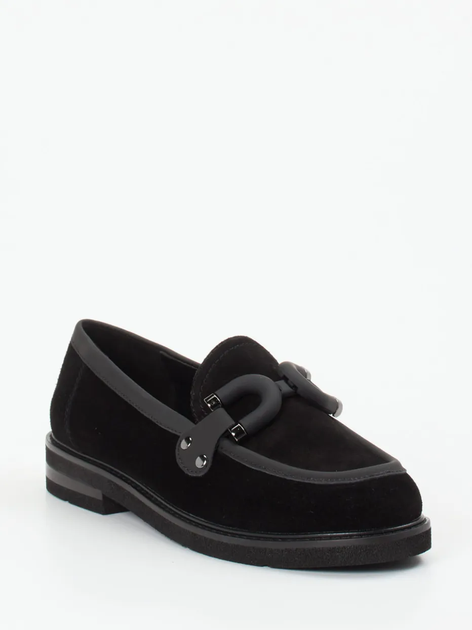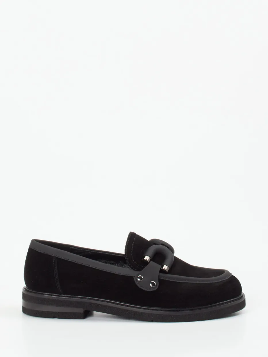 Eleganter Damen-Loafer aus sattschwarzem Veloursleder mit matter Zierspange – ideal für moderne Business- und Freizeit-Outfits im Zeichen des Quiet Luxury.