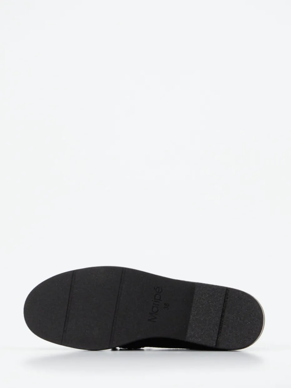 Schlichte Eleganz für Alltag und Business.Maripé interpretiert den klassischen Damen-Loafer in schwarzem Veloursleder mit minimalistischer Raffinesse. Bei langem Büroalltag oder stilvollen City-Einsätzen bietet dieser Slipper dank weichem Kalblederfutter und gepolsterter Decksohle hohen Tragekomfort. Die samtig matte Lederoberfläche kombiniert mit Ton-in-Ton-Paspelierung und silberakzentuierter Zierspange wirkt souverän reduziert. Die flache Form und die leichte Laufsohle unterstützen ein müheloses, alltagstaugliches Styling. Mattschwarze Details und klare Linien greifen die Designkodizes des „Quiet Luxury“-Trends auf. Ein souveräner Stilbaustein für anspruchsvolle Looks mit langlebigem Charakter.