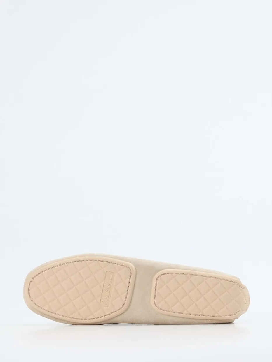 Sportlich zeigt sich die Marke Pretty Ballerinas durch diesen sommerlichen Loafer. Das beigefarbene Veloursleder ist ledergefüttert und sehr weich. Typisch sind die unterschiedlichen Steppnähte. Das wirkt lässig und sportiv. Der bequeme Gummiboden besteht aus zwei Kassetten, an der Ferse ist die Sohle im Stil der Autofahrerschuhe hochgezogen. Unverwechselbar wird der Slipper durch das dort eingeprägte Markenlogo.