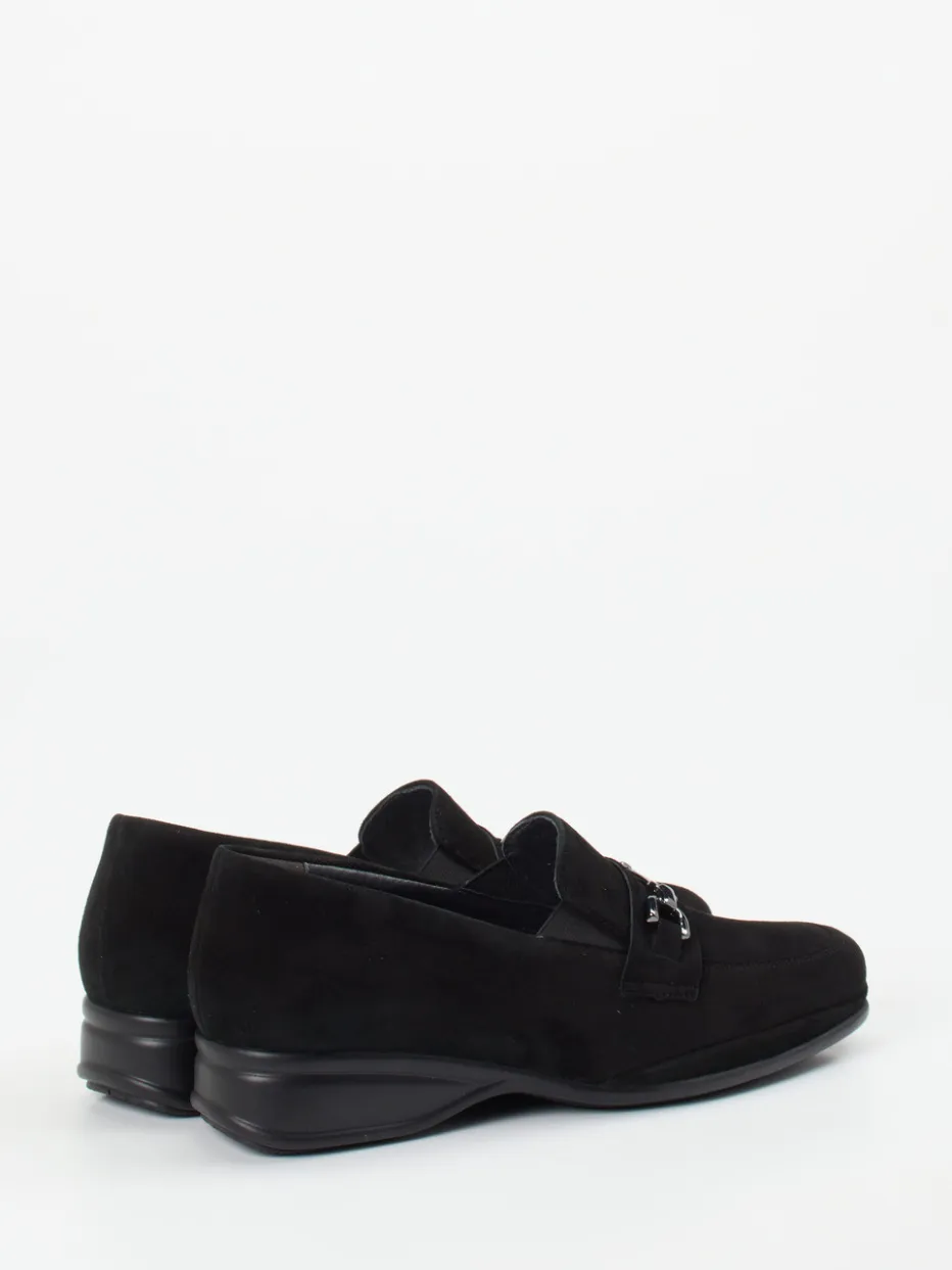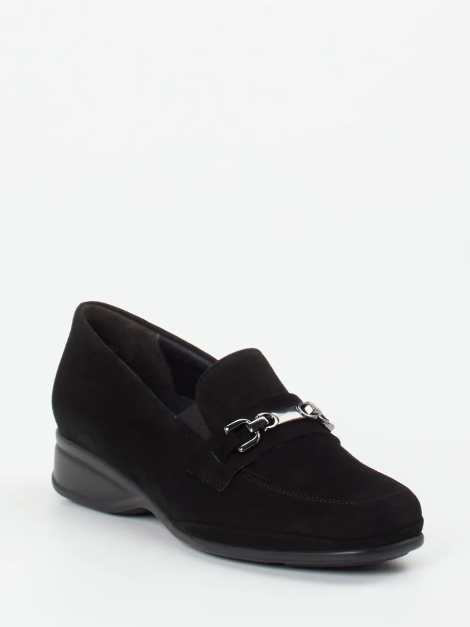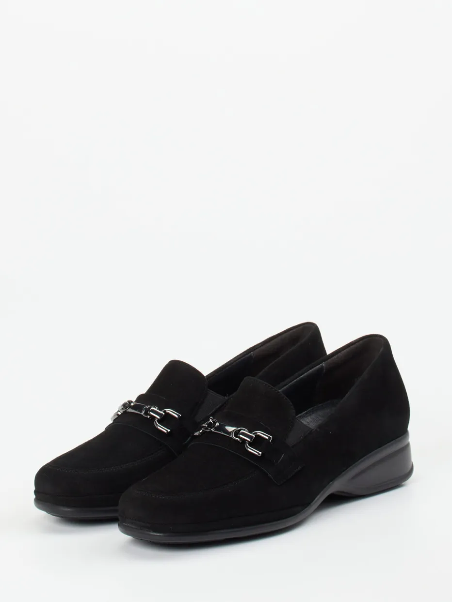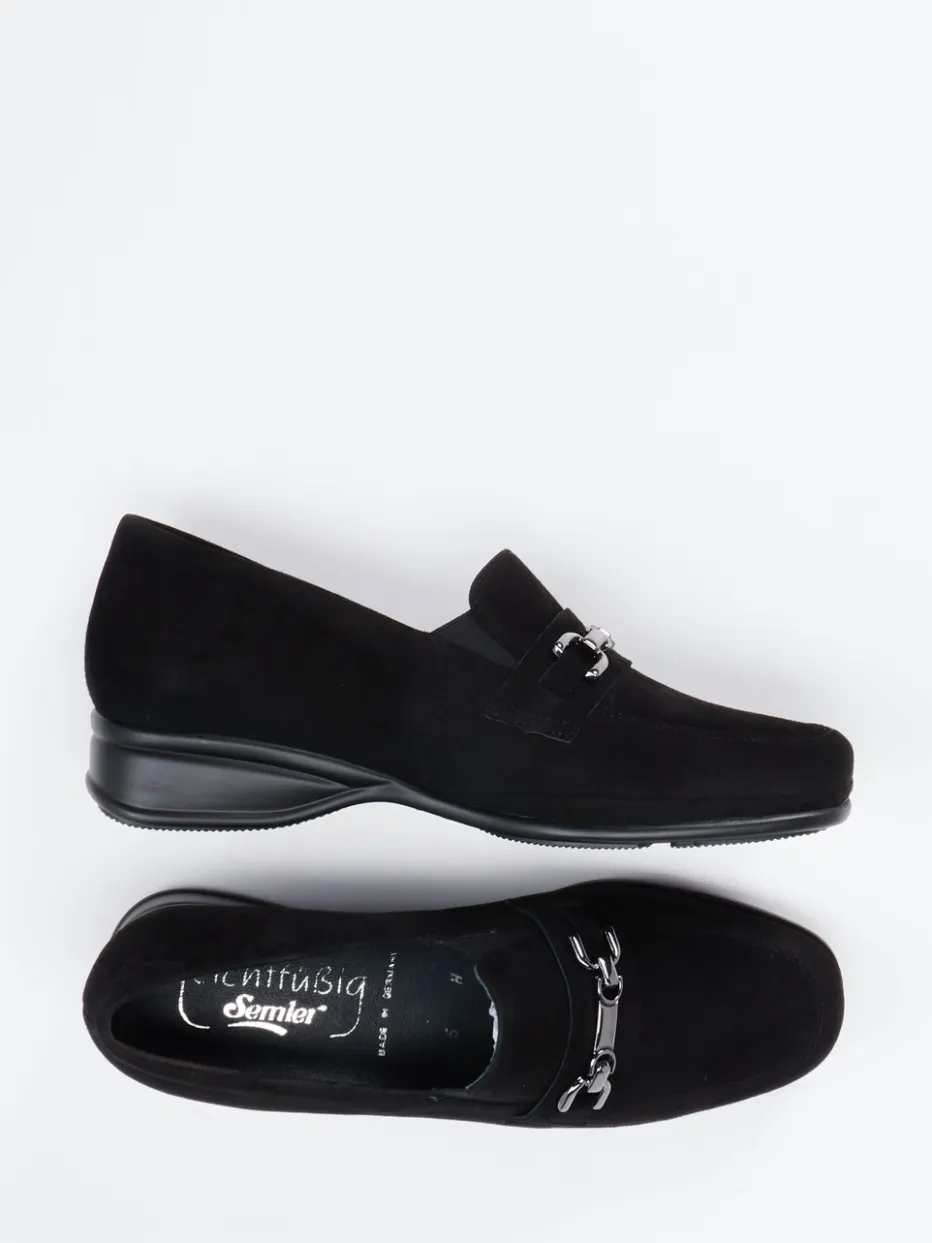 Semler kombiniert bei diesem Loafer weiches Veloursleder in Schwarz mit ergonomischen Details für spürbaren Komfort. Die silberfarbene Spange setzt einen dezenten Akzent.