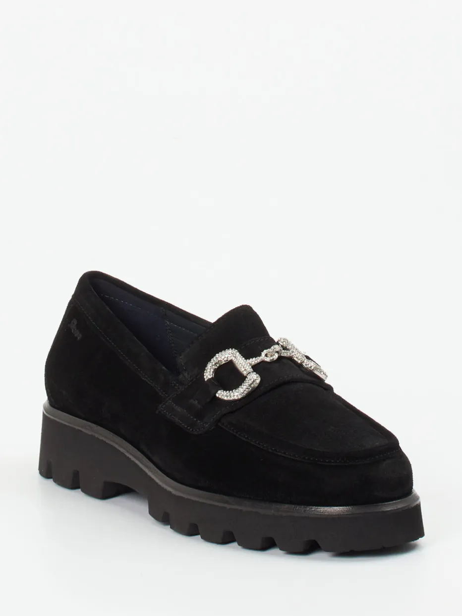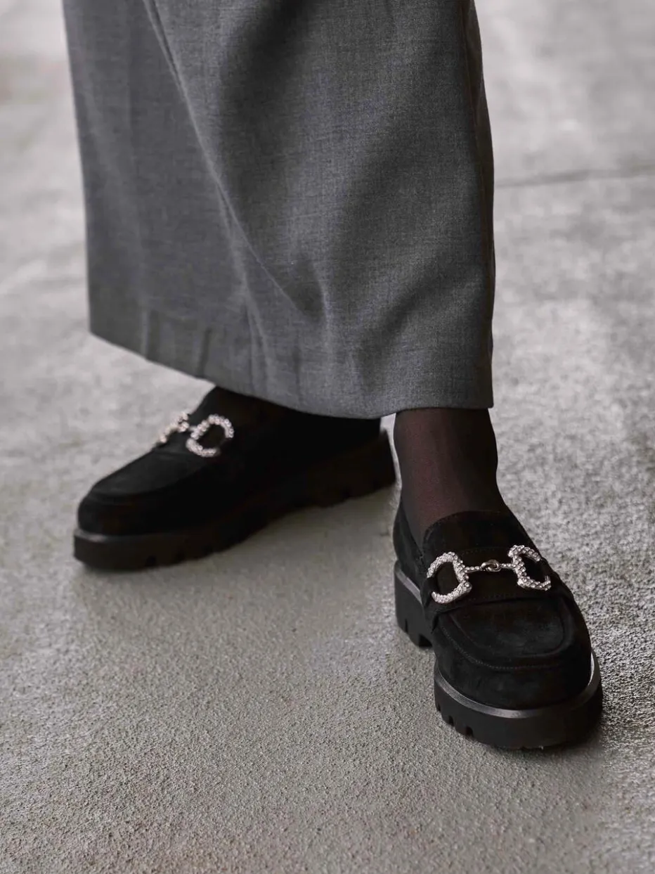 Veloursleder trifft Strass: Dieser Loafer von Sioux setzt auf hochwertigen Komfort und dezente Glamour-Akzente im Business-Alltag.