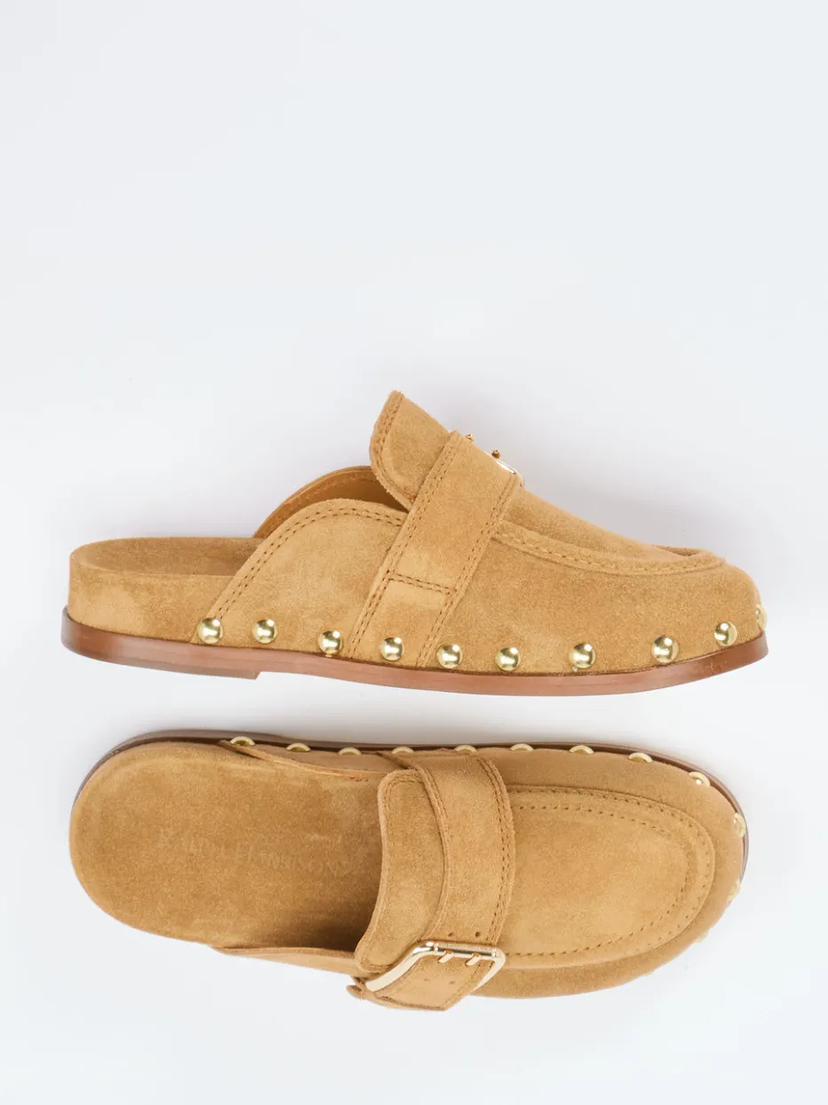 Boho-Eleganz für warme Tage.Ralph Harrison präsentiert mit diesen Damen-Loafer-Mules ein charmantes Modell für die Sommermonate. Ideal für entspannte Alltagsmomente oder stylische Freizeit-Looks: Das hellbraune Veloursleder mit samtig weicher Oberfläche wird durch eine dekorative Mokassinnaht und eine goldfarbene Schließe stilvoll akzentuiert. Rundum platzierte Nieten setzen ein modisches Statement und greifen Metallic-Trends auf. Die offene Silhouette mit flacher Laufsohle und weich gepolstertem Fußbett verspricht ein angenehmes Tragegefühl. Der Look passt hervorragend zu leichten Leinenstoffen und cognacfarbenen Accessoires. Ralph Harrison steht hier für stilvoll kombinierten Komfort im Boho-Chic.