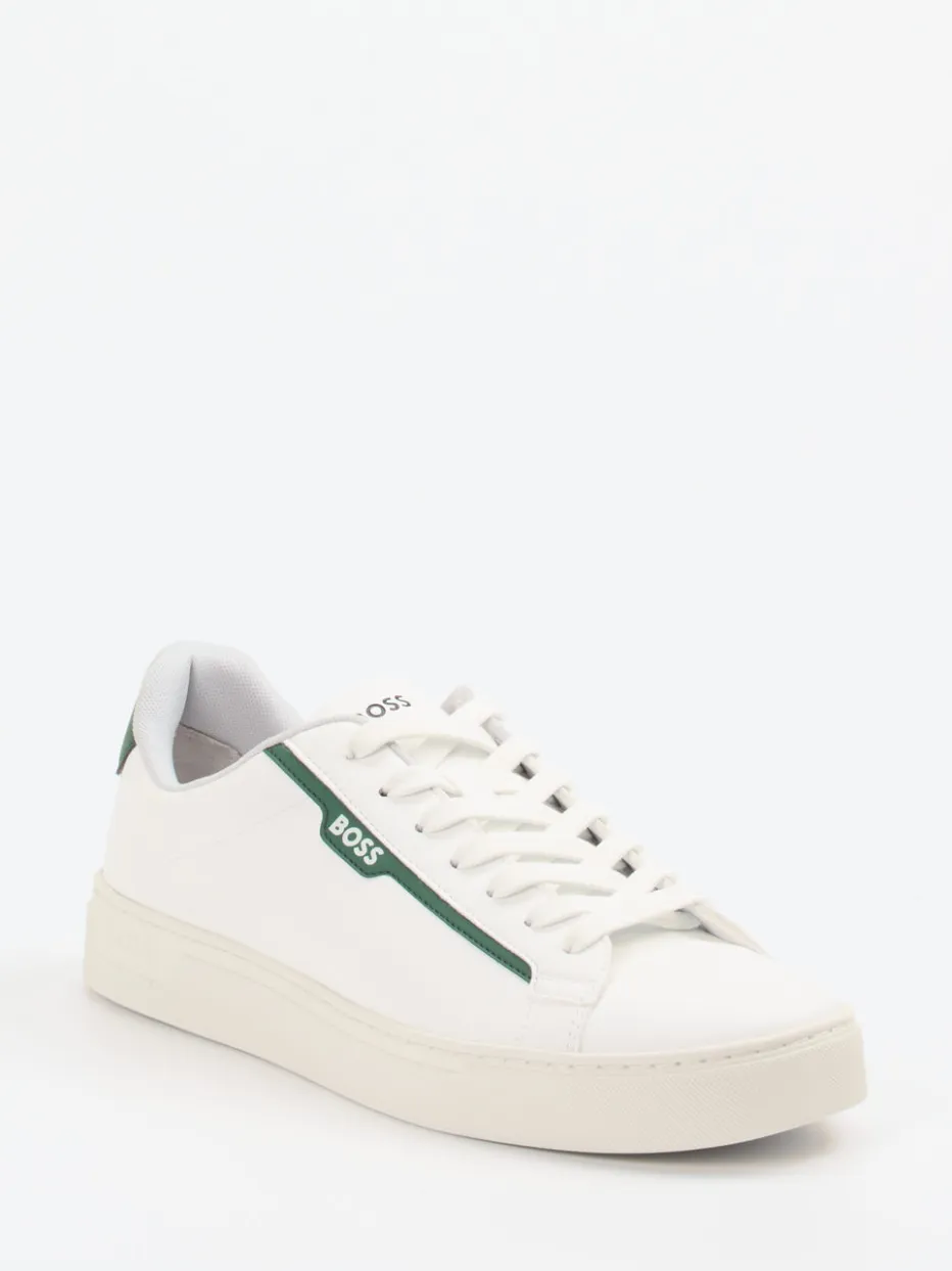 Minimalistischer Look trifft Retro-Vibe.Boss bringt mit diesem Herren-Low-Top einen sportlich-eleganten Sneaker auf den Punkt. Für entspannte City-Walks oder stilbewusste Office-Tage überzeugt das Modell mit softem Kalbleder und matter Oberfläche. Der Off-White-Grundton wird durch einen grün abgesetzten Seitenstreifen mit Logo sowie einem Ferseneinsatz aus grauem Veloursleder akzentuiert. Die flache Silhouette mit Schnürverschluss und griffig strukturierter Gummisohle unterstreicht die klare Formsprache. Design und Details passen ideal zu minimalistischen Quiet-Luxury-Looks. Ein vielseitiger Premium-Sneaker mit typischer Boss-Formensprache für urbane Everyday-Kombis.
