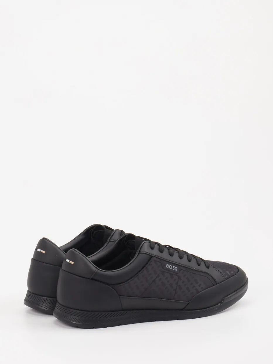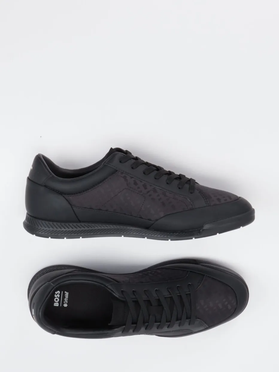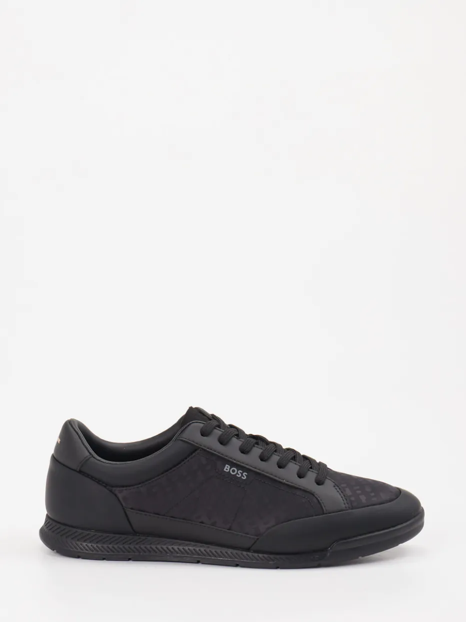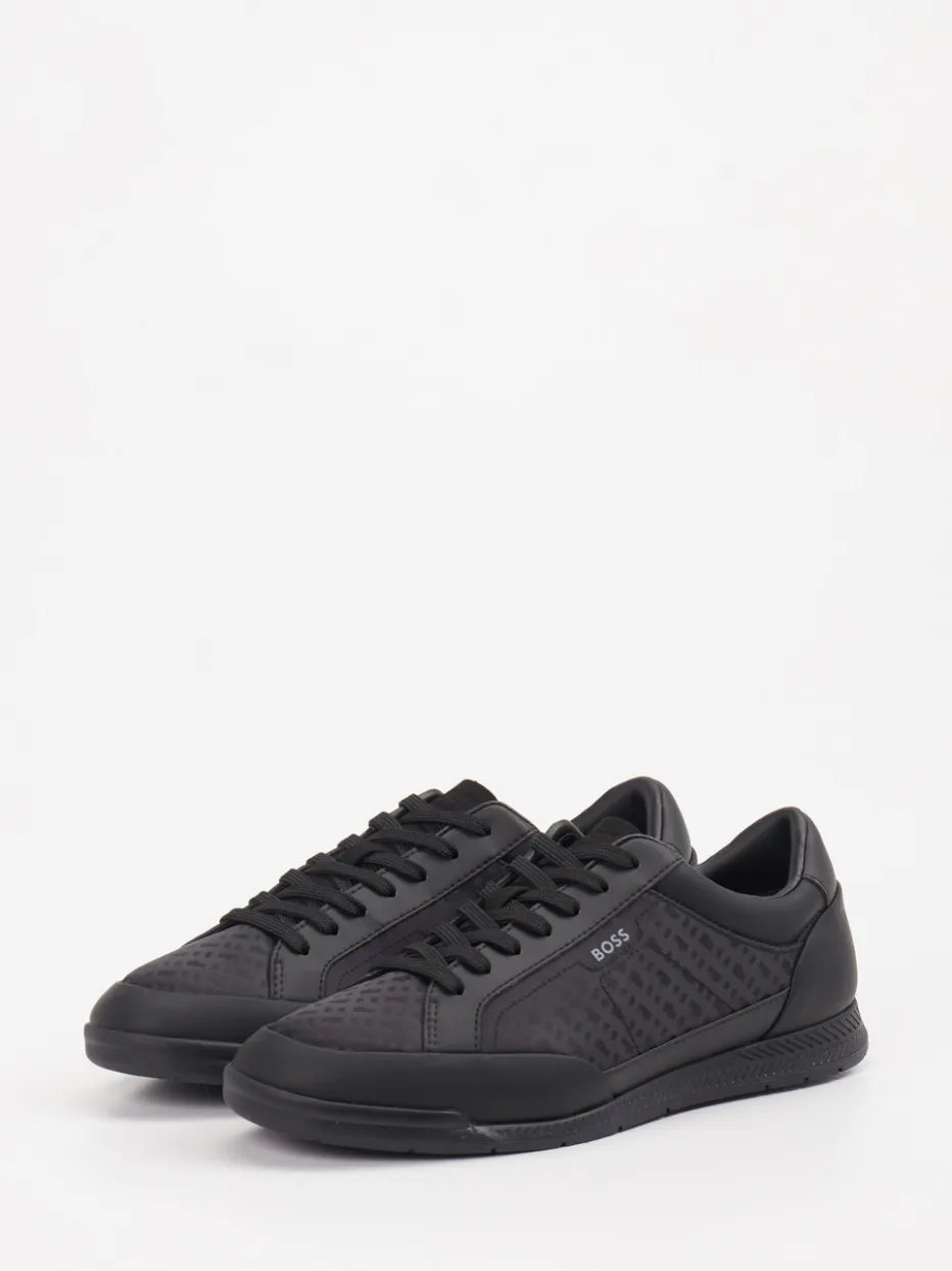 Schwarz in Perfektion. Boss präsentiert mit diesem Low-Top-Sneaker ein Herrenmodell, das modernes Design und klassische Zurückhaltung verbindet. Ideal für den urbanen Alltag oder das Business Casual Outfit: Der Sneaker aus Textil und Synthetik zeigt sich in mattem Schwarz und überzeugt durch sein Ton-in-Ton-Monogramm sowie ein dezentes seitliches Logo-Detail. Die flache Silhouette, der gepolsterte Schaftrand und die robuste Gummisohle bieten angenehmen Tragekomfort. Der cleane Look passt perfekt zu monochromen Looks und ruhig gestalteten Styles. Kombiniert mit schwarzer Cap oder Crossbody-Bag wirkt das Ensemble stilvoll und durchdacht. Ein Modell, das durch diskrete Raffinesse und markentypische Formsprache überzeugt.