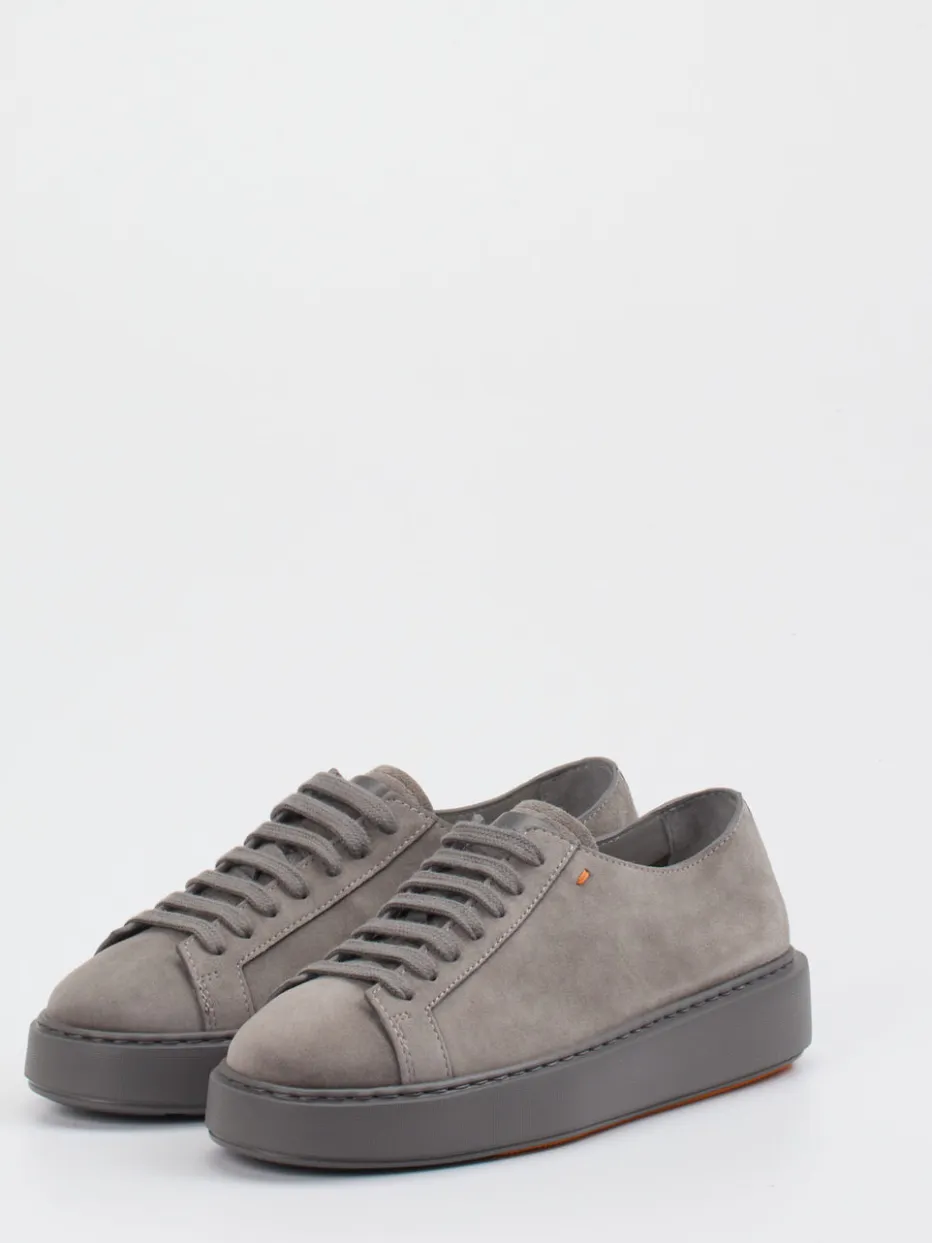 Santoni präsentiert einen Low-Top Sneaker aus Veloursleder in edlem Mittelgrau. Eine cleane Silhouette, kombiniert mit tonaler Schnürung, trifft auf eine charakterstarke Plateausohle mit orangefarbenem Akzent.