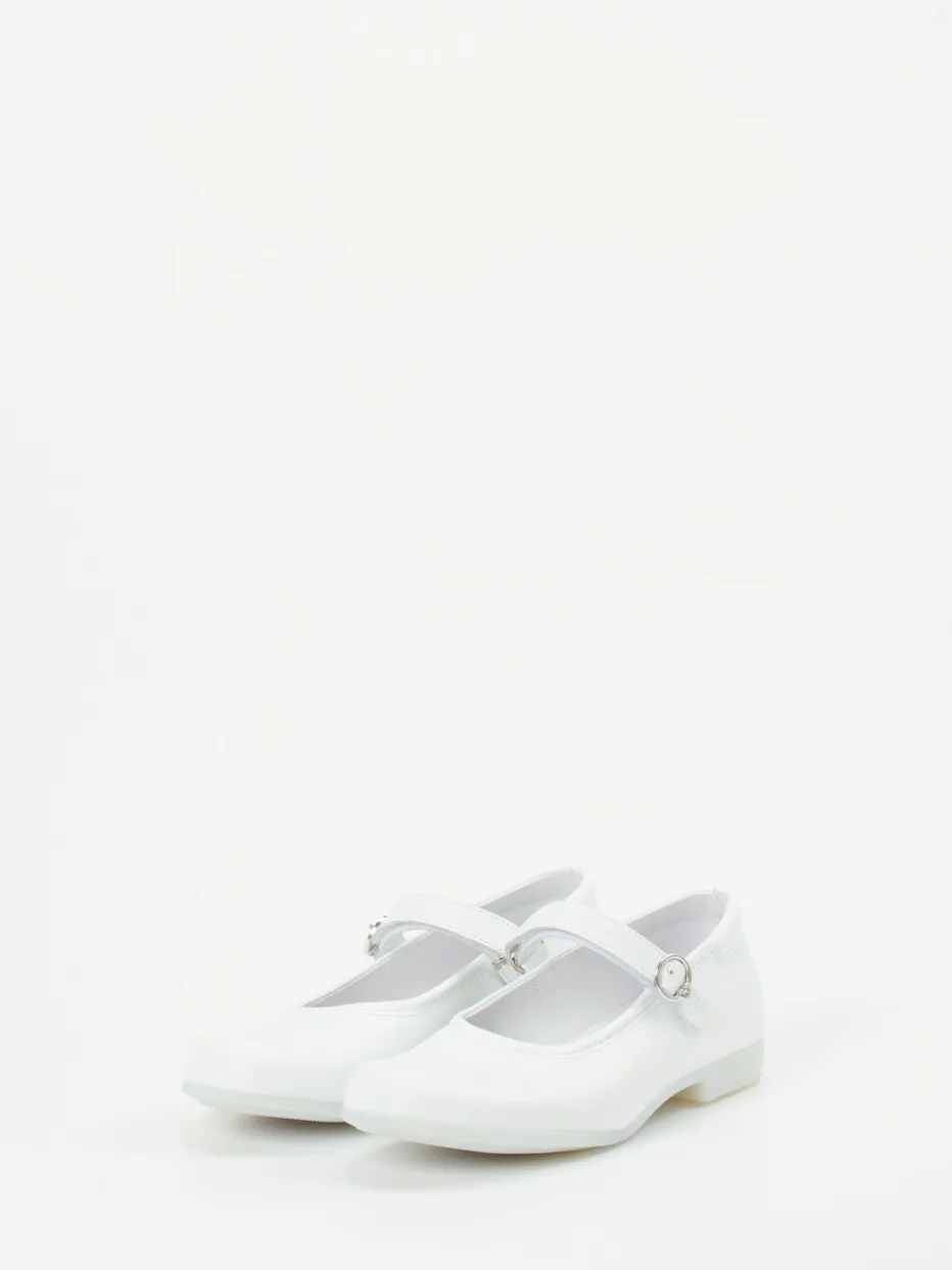Eleganz für kleine Schritte.Ralph Harrison Classic präsentiert klassische Mary-Jane-Ballerinas für Mädchen. Ideal für feierliche Anlässe bietet das Modell mit glänzendem, weißem Kalbleder eine stilvolle Lösung für besondere Outfits. Die runde Silhouette, der Riemen mit silberfarbener Schnalle und die flache, transparente Gummisohle sorgen für einen zeitlosen Look mit modernen Akzenten. Das softe Lederfutter und die gepolsterte Decksohle bieten angenehmen Tragekomfort. Inspiriert von „Balletcore“ und „Quiet Luxury“ passt dieses Modell zu festlichen Kleidern wie zu minimalistischen Alltagsstyles. Ralph Harrison Classic kombiniert hochwertige Verarbeitung mit stilvoller Zurückhaltung.
