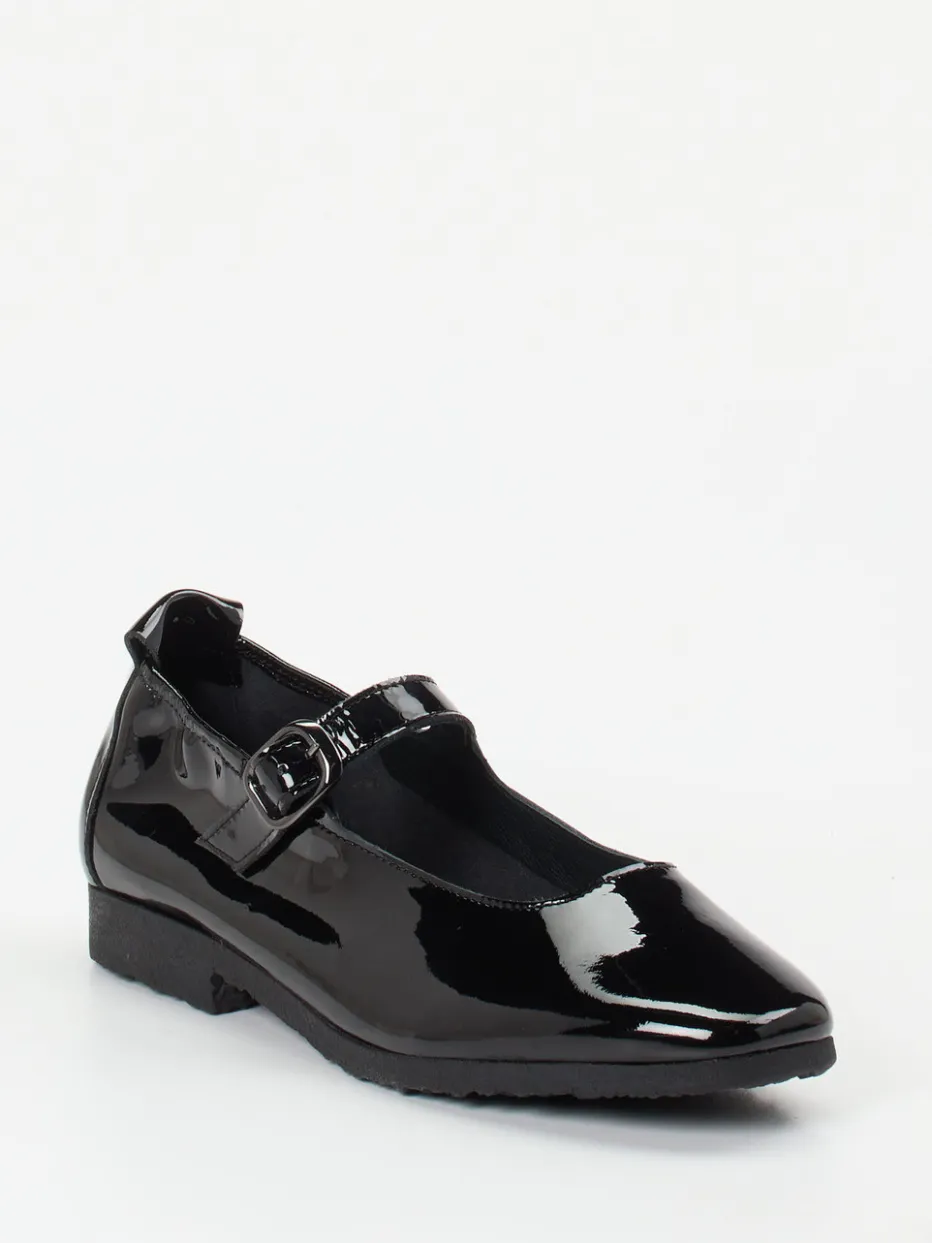 Ideal für Office-Tage oder City-Ausflüge: Diese schwarzen Ballerinas verbinden hochwertiges Lackleder mit glänzender Oberfläche und flacher, flexibler Gummisohle. Der verstellbare Riemen mit feiner Metallschnalle sorgt für sicheren Halt und stilvolle Akzente. Die klare Silhouette und Ton-in-Ton-Nähte betonen ihren minimalistischen Charakter, passend zu Quiet-Luxury- und Balletcore-Trends. Besonders harmonisch wirken sie in Kombination mit blickdichter Strumpfhose und schlichter Lederhandtasche.
