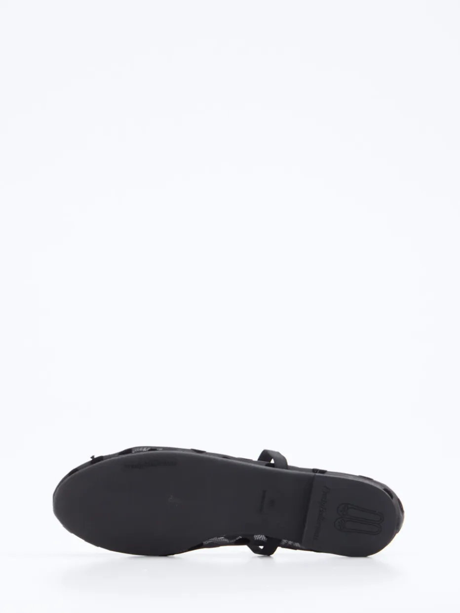 Ideal für warme Tage, wenn Leichtigkeit und Stil gefragt sind: Das weiche Meshmaterial in elegantem Schwarz zeigt sich halbtransparent und wird durch samtige Punkte veredelt. Ein elastischer Riemen sorgt für guten Halt, während die flache Sohlenform mit dezenter Zierschleife für klassische Silhouette sorgt. Der Vintage-inspirierte Look überzeugt sowohl beim Stadtbummel als auch zur Abendveranstaltung. Besonders harmonisch mit einer gemusterten Feinstrumpfhose und kleiner Samtclutch.