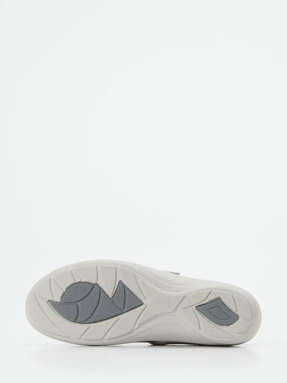Unaufdringlicher Glanz im Alltag.Die Marke Semler präsentiert mit diesem Mary-Jane-Halbschuh ein Modell für stilbewusste Komfortliebhaberinnen. Ob beim Stadtbummel oder im entspannten Alltag: Das weiche Veloursleder, samtig angeschliffen, zeigt sich in hellgrauer Optik mit einem silbernen Metallic-Einsatz im Vorderfußbereich – ein geschmackvoller Kontrast zur matten Oberfläche. Der Klettverschluss-Riemen erleichtert das An- und Ausziehen und sorgt für sicheren Halt. Die ergonomisch geformte PU-Luftpolstersohle bietet angenehme Flexibilität, das gepolsterte Fußbett eignet sich für Einlagen. Die abgerundete Form folgt einem komfortorientierten Designansatz, inspiriert vom Minimalismus aktueller Trends. Kombinierbar mit Stretch-Hosen oder legerem Strick. Semler steht für alltagstaugliche Qualität mit bequemer Passform und zurückhaltender Raffinesse.