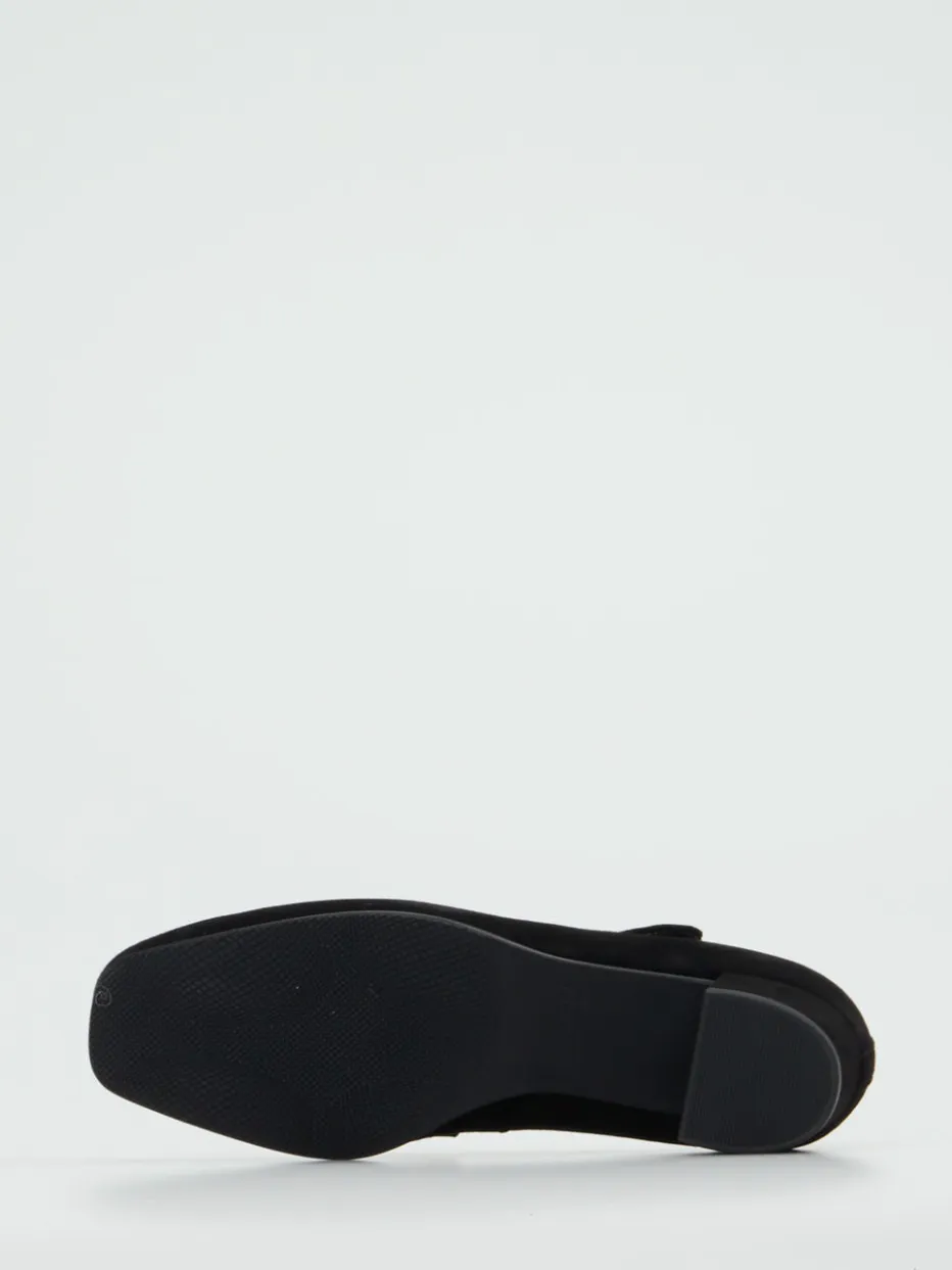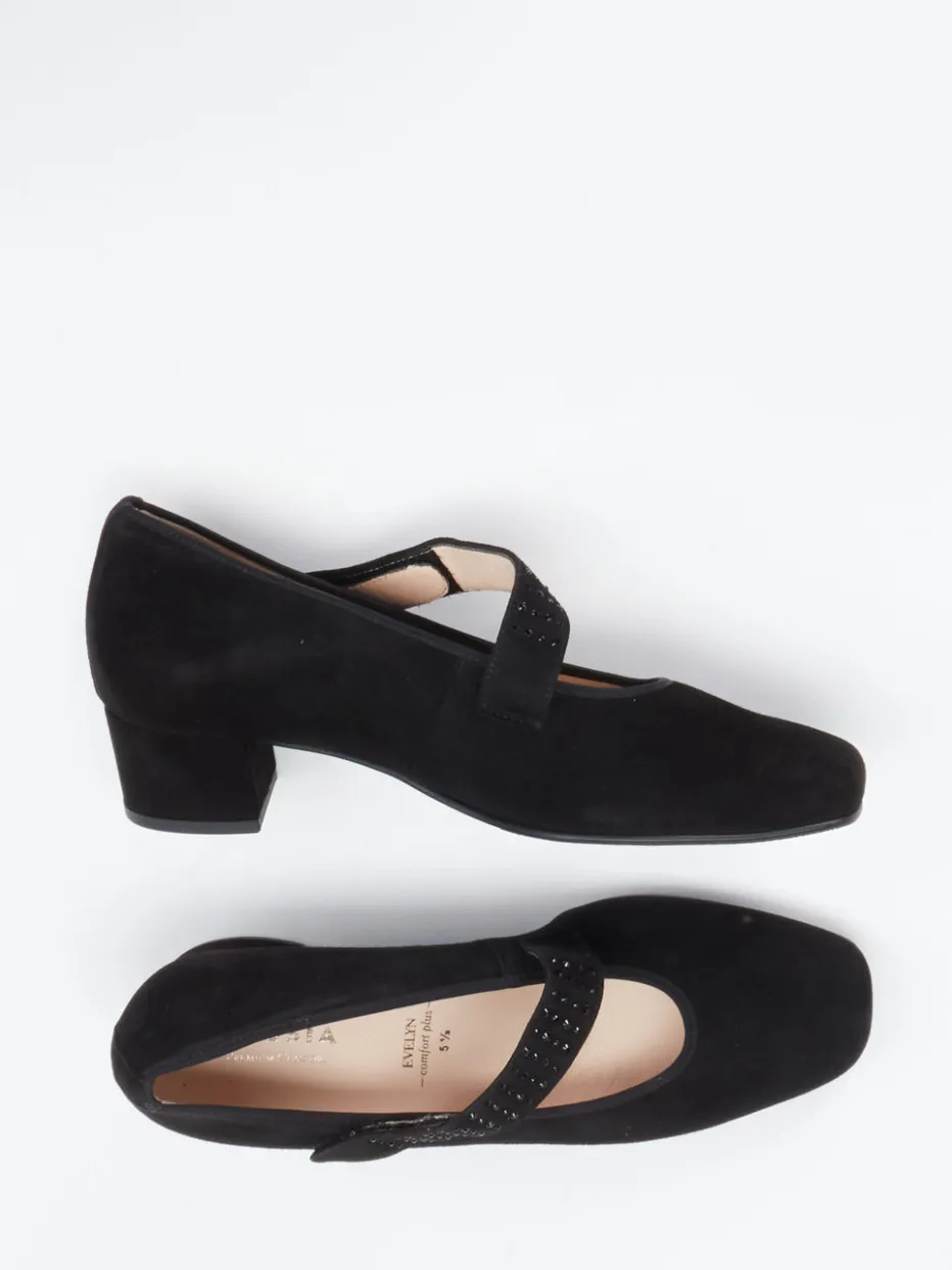 Der elegante Spangenpumps von Hassia verbindet samtiges Veloursleder mit einem funkelnden Strassriemen und bequemem Blockabsatz.
