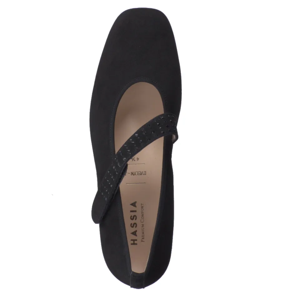Stilvoll durch den Tag.Hassia interpretiert den klassischen Mary-Jane-Pump mit dem Modell Evelyn auf elegante Weise neu. Ideal für den Alltag im Büro oder formelle Anlässe bietet dieser Pumps hohen Komfort durch das anschmiegsame Veloursleder in mattem Schwarz. Der asymmetrisch platzierte Klettverschluss-Riemen ist mit funkelnden Swarovski-Steinen verziert und individuell verstellbar. Die klassische, geschlossene Form mit rundem Ausschnitt trifft auf einen 3 cm hohen Blockabsatz und sorgt für stabilen Halt. Dank Vario-Fußbett eignet sich das Modell auch für Einlagen. Ein toniger Elasteinfass unterstützt die passgenaue Silhouette. Ein souveräner Auftritt mit femininer Ästhetik und leiser Raffinesse.