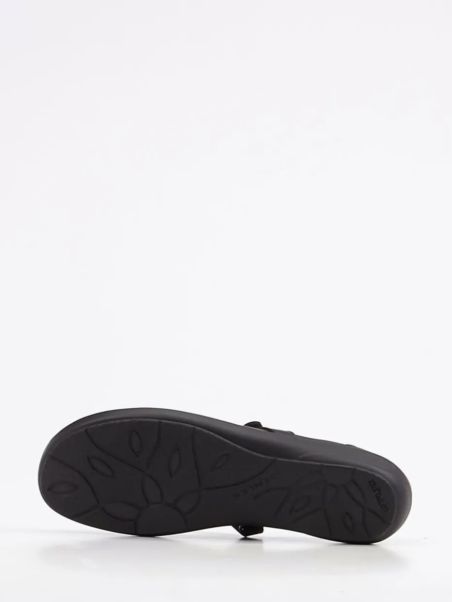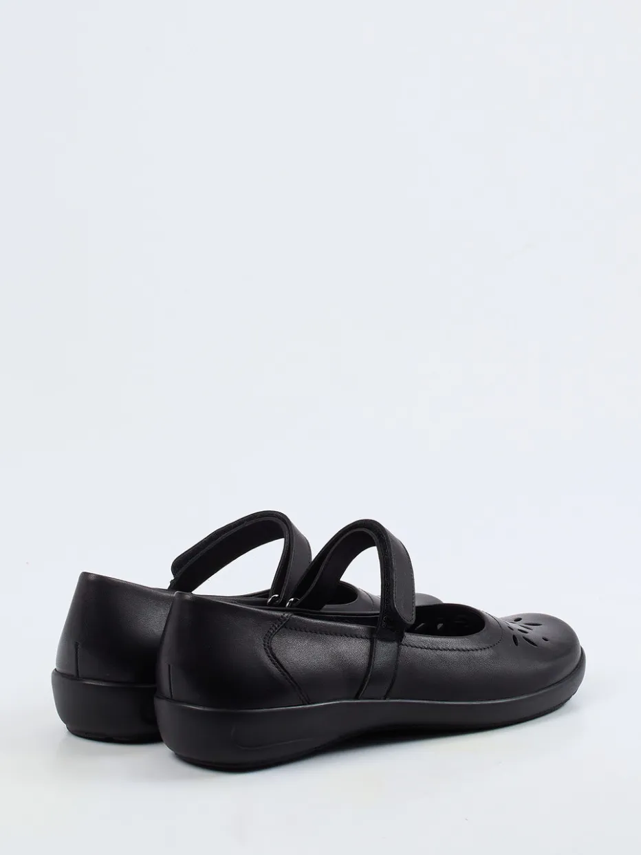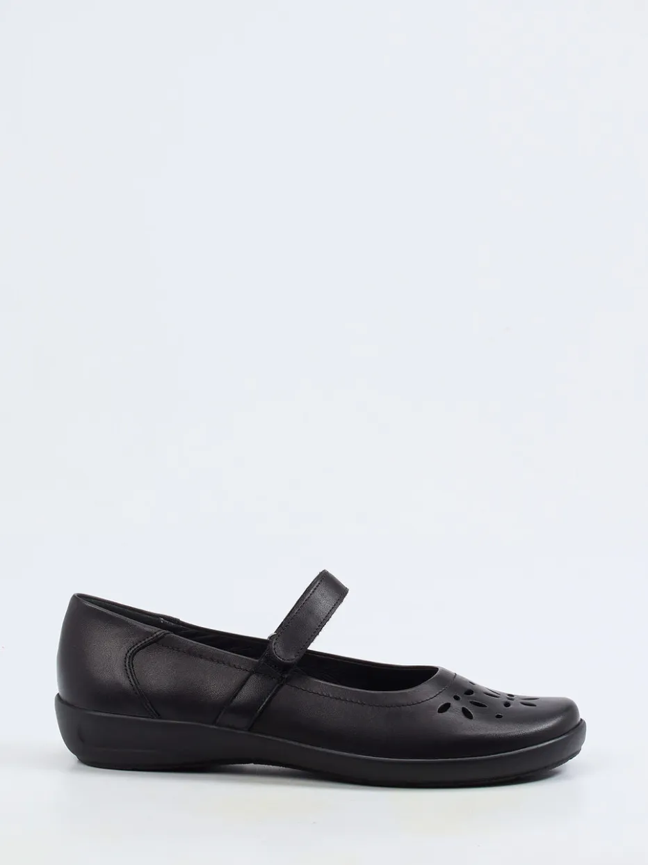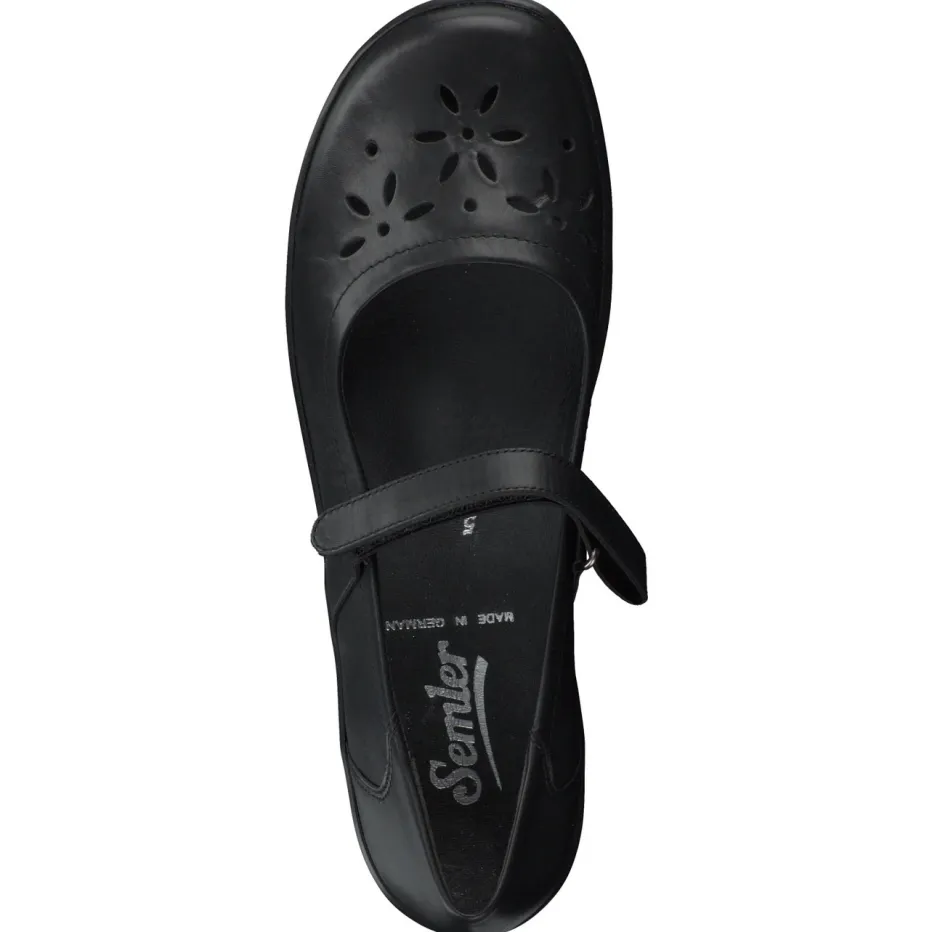 Leichtigkeit trifft Komfort.Semler präsentiert einen klassischen Mary-Jane-Schuh für Damen mit hohem Trageanspruch. Ideal für den Alltag oder entspannte Stunden zu Hause bietet dieses Modell in Weite H eine luftige und bequeme Lösung. Gefertigt aus schwarzem Kalbleder und versehen mit einem floralen Laserdruck auf dem Blatt, zeigt sich der Schuh stilvoll zurückhaltend. Die matt schimmernde Oberfläche, ein individuell einstellbarer Ristriemen mit Klettverschluss und eine flexible PU-Sohle mit Luftpolsterung sorgen für zusätzlichen Komfort. Die herausnehmbare Innensohle macht ihn auch für Einlagen geeignet. Inspiriert von Retro-Femininität passt das Design zu schmalen Hosen oder luftigen Kleidern. Zeitloser Komfort mit typischer Semler-Präzision.