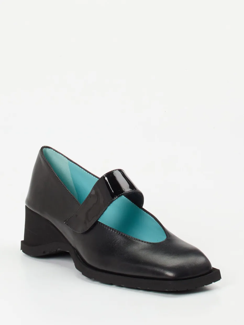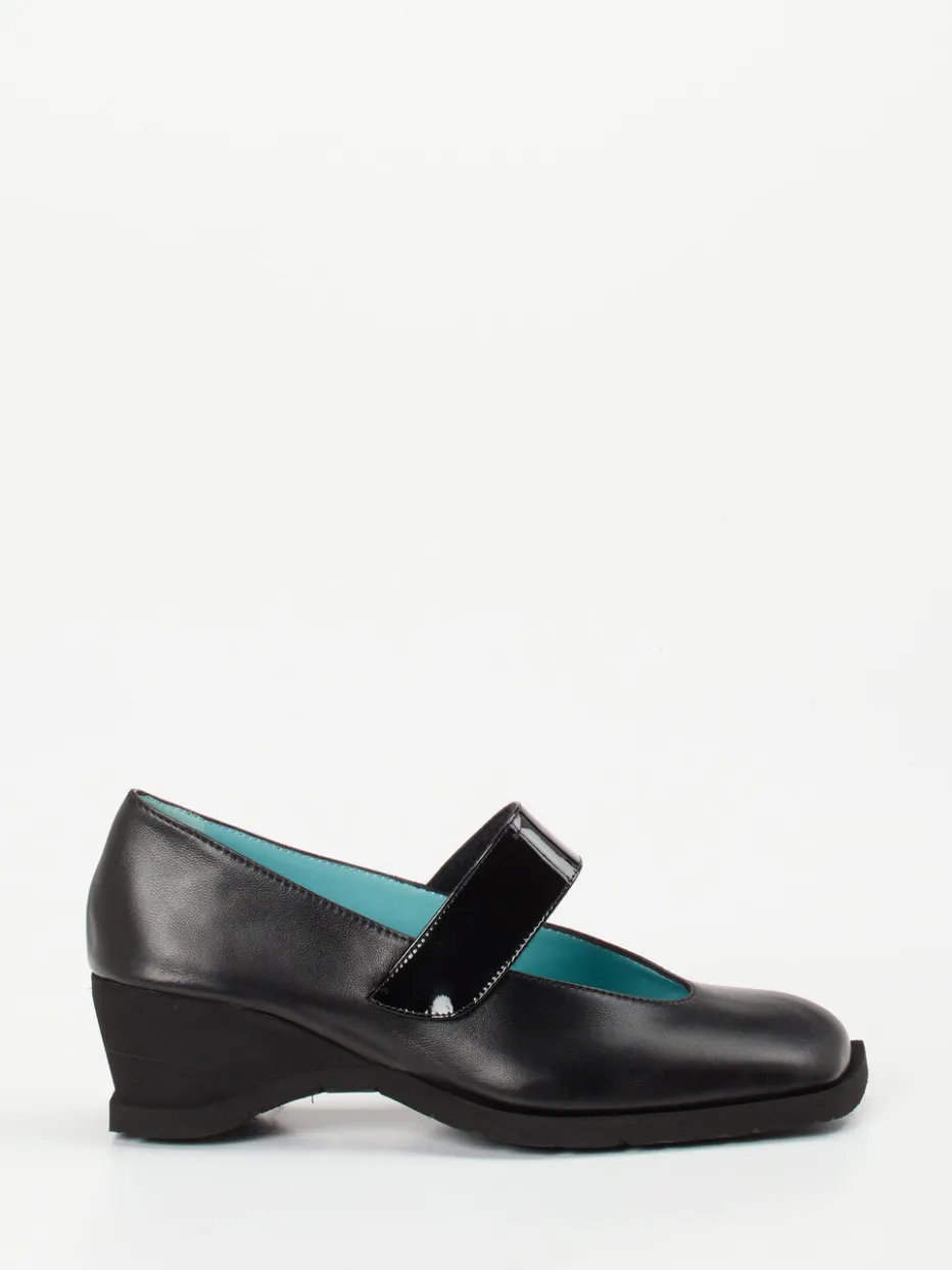 Für Tage mit vielen Schritten bietet dieser schwarze Spangenpumps aus weichem Lammleder sicht- und fühlbaren Komfort. Ein glänzender Riemen aus Lackleder setzt einen stilvollen Akzent und ermöglicht dank Klettverschluss eine exakte Weiteneinstellung. Der Keilabsatz mit profilierter Gummisohle bietet Stabilität – auch auf glatten Böden. Innen überrascht hellblaues Lammnappa mit luxuriösem Finish. Ideal für klassische Business-Looks sowie puristische Freizeit-Outfits. Besonders harmonisch zu Midirock oder Culottes.