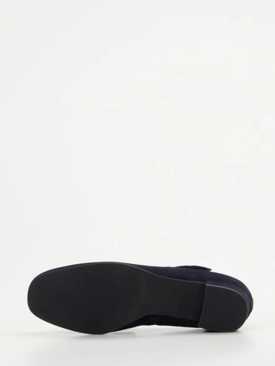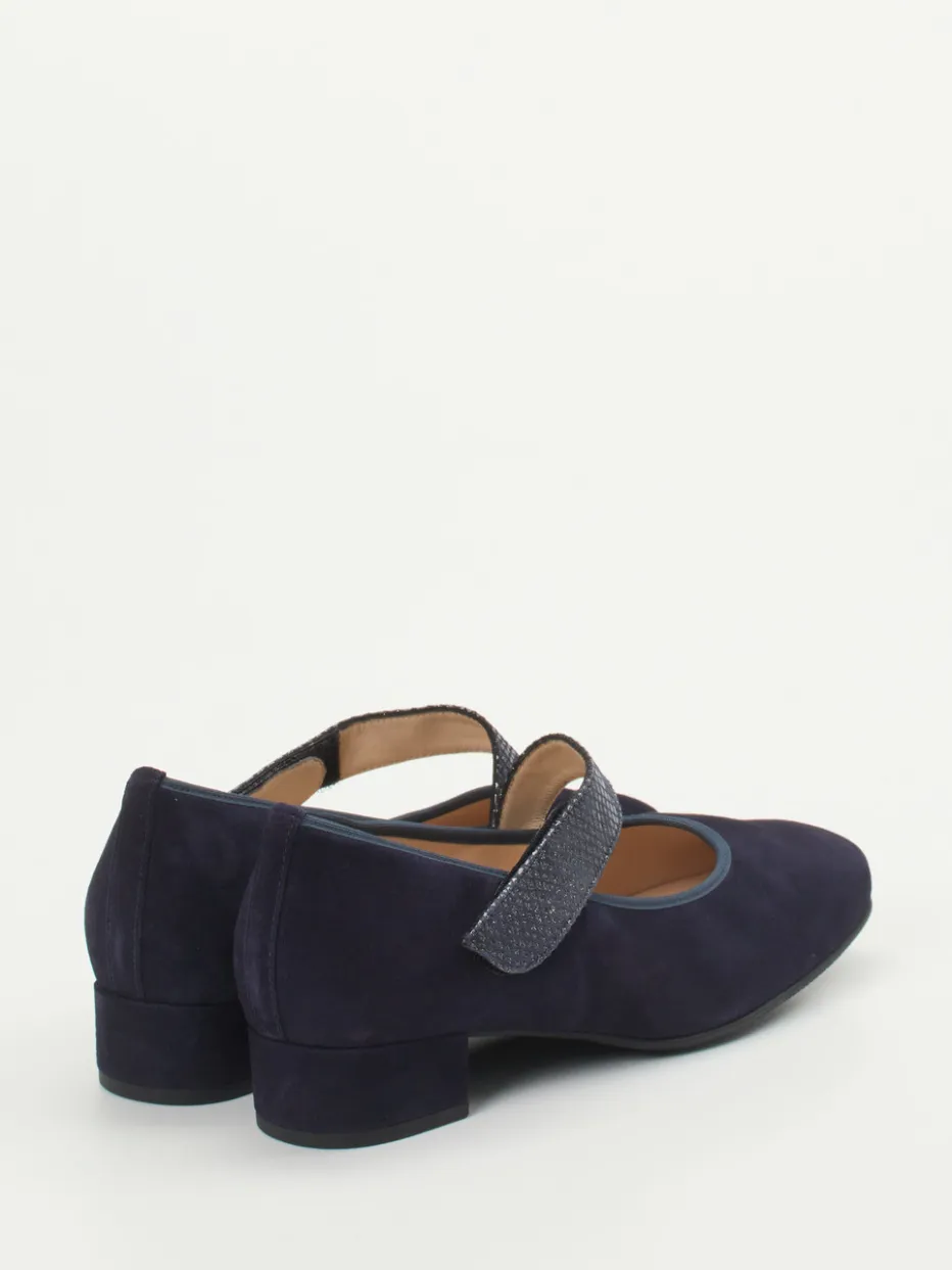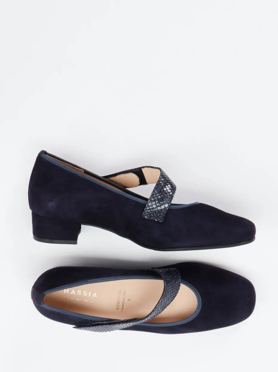 Komfort trifft dezentes Design.Der Mary Jane Halbschuh von Hassia ist ein stilvoller Begleiter für Alltag und Büro. Einlegesohlenfreundlich und angenehm weit geschnitten, sorgt der Schuh mit seiner flexiblen Gummisohle und dem 3 cm Blockabsatz für sicheren Halt bei langen Tagen. Das dunkelblaue Veloursleder zeigt sich matt und weich, während der schimmernde Klettverschluss-Riemen in Reptilprägung einen raffinierten Akzent setzt. Die klassische, runde Silhouette unterstreicht den dezenten Vintage-Charme, inspiriert vom Quiet-Luxury-Trend. Ein funktional-eleganter Favorit mit stilistischer Zurückhaltung – getragen mit Feinstrick und gedeckten Accessoires ein stimmiger Ensemblepartner.