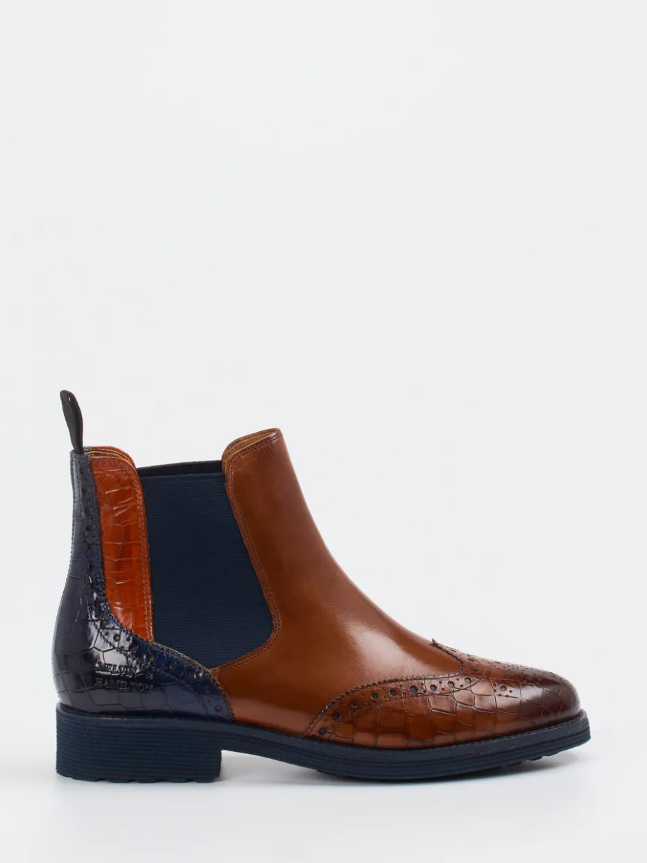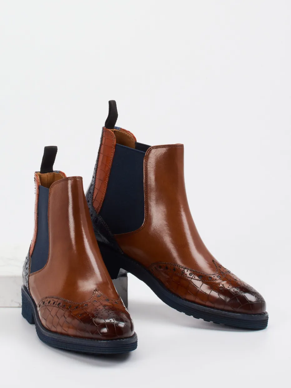 Stilvoller Auftritt im herrenklassischen Look.Melvin & Hamilton präsentiert diese Chelsea Boots für Herren aus edlem Kalbleder. Die schmal zulaufenden Stiefeletten in Mittelbraun mit kontrastierender dunkelblauer Profilsohle überzeugen durch ihre glänzende zweifarbige Kroko-Prägung und stilvolle Brogue-Details. Elastikeinsätze und eine praktische Zuglasche bieten komfortables Anziehen, während die Gummisohle sicheren Halt im urbanen Alltag gewährleistet. Die klassische Silhouette passt sowohl zur Business-Garderobe als auch zu minimalistischen Casual-Looks. Heritage trifft auf Quiet Luxury – perfekt für die Herbst/Winter-Saison. Ein charakterstarker Schuh für anspruchsvolle Herren mit Stilbewusstsein.