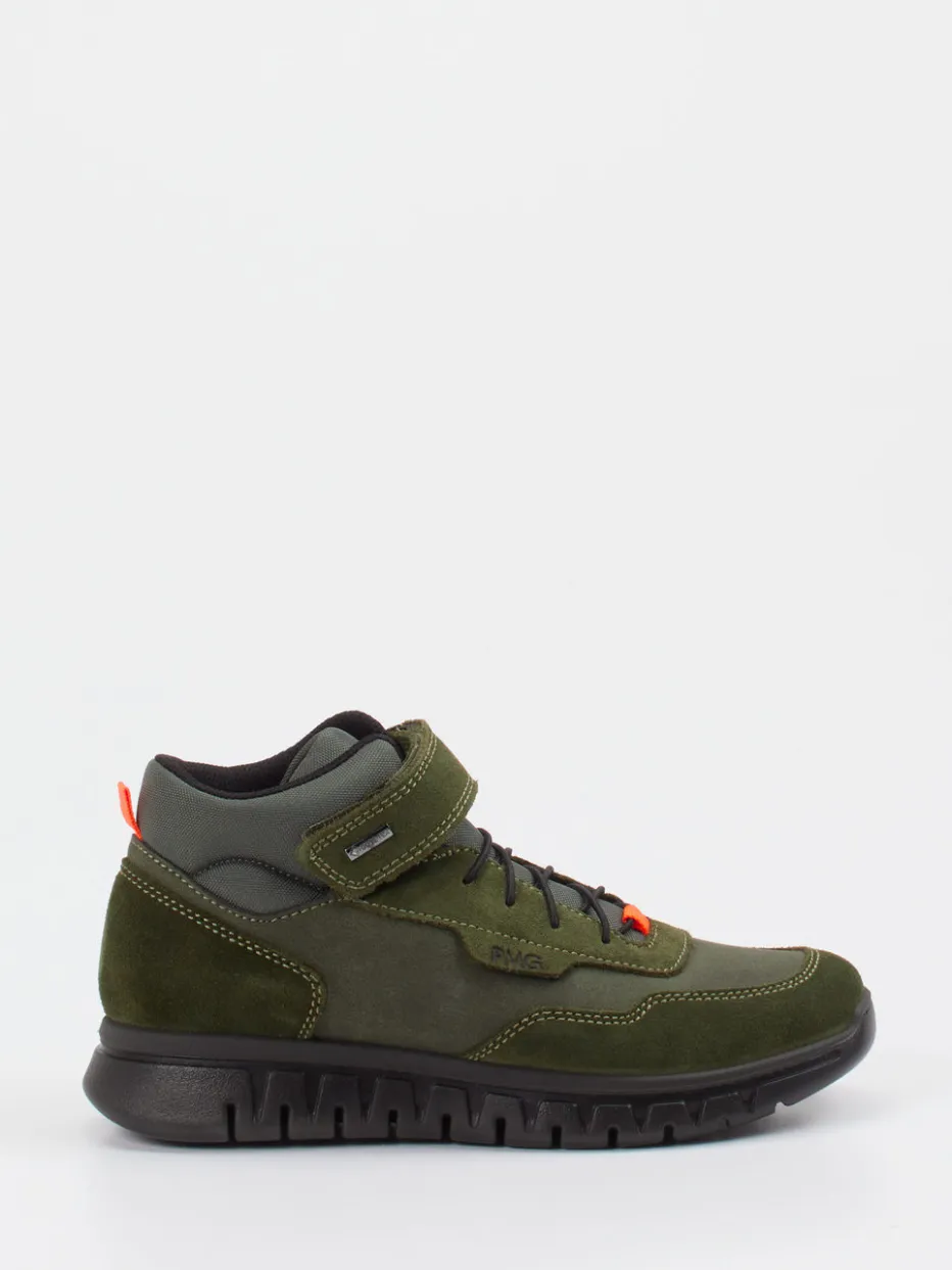 Bereit für Entdeckungstouren.Primigi präsentiert hier einen funktionalen Mid-Cut Sneaker für Kinder. Ideal für aktive Tage im Freien: Das Modell kombiniert strapazierfähiges Veloursleder mit textilem Einsatz zu einem robusten Materialmix. Das olivgrüne Obermaterial wird durch Kontrastnähte in Gelbgrün und orangefarbene Details betont. Der Mix aus Schnürung und Klettverschluss erleichtert das An- und Ausziehen, während reflektierende Logoelemente für Sichtbarkeit sorgen. Eine griffige Gummisohle bietet zuverlässigen Halt auf unterschiedlichen Untergründen. Inspiriert vom Gorpcore-Stil passt der Schuh auch zur heutigen Streetwear. Zuverlässige Passform mit funktionellen Highlights – für kindgerechtes Outdoor-Design von Primigi.