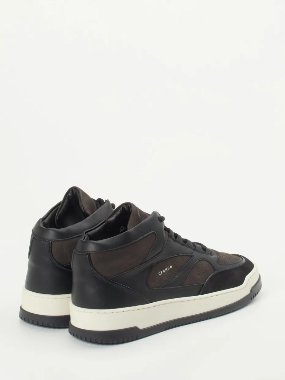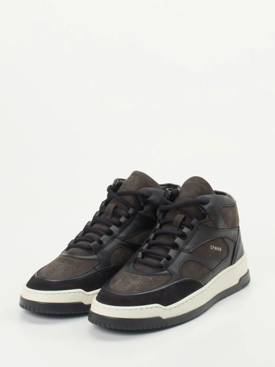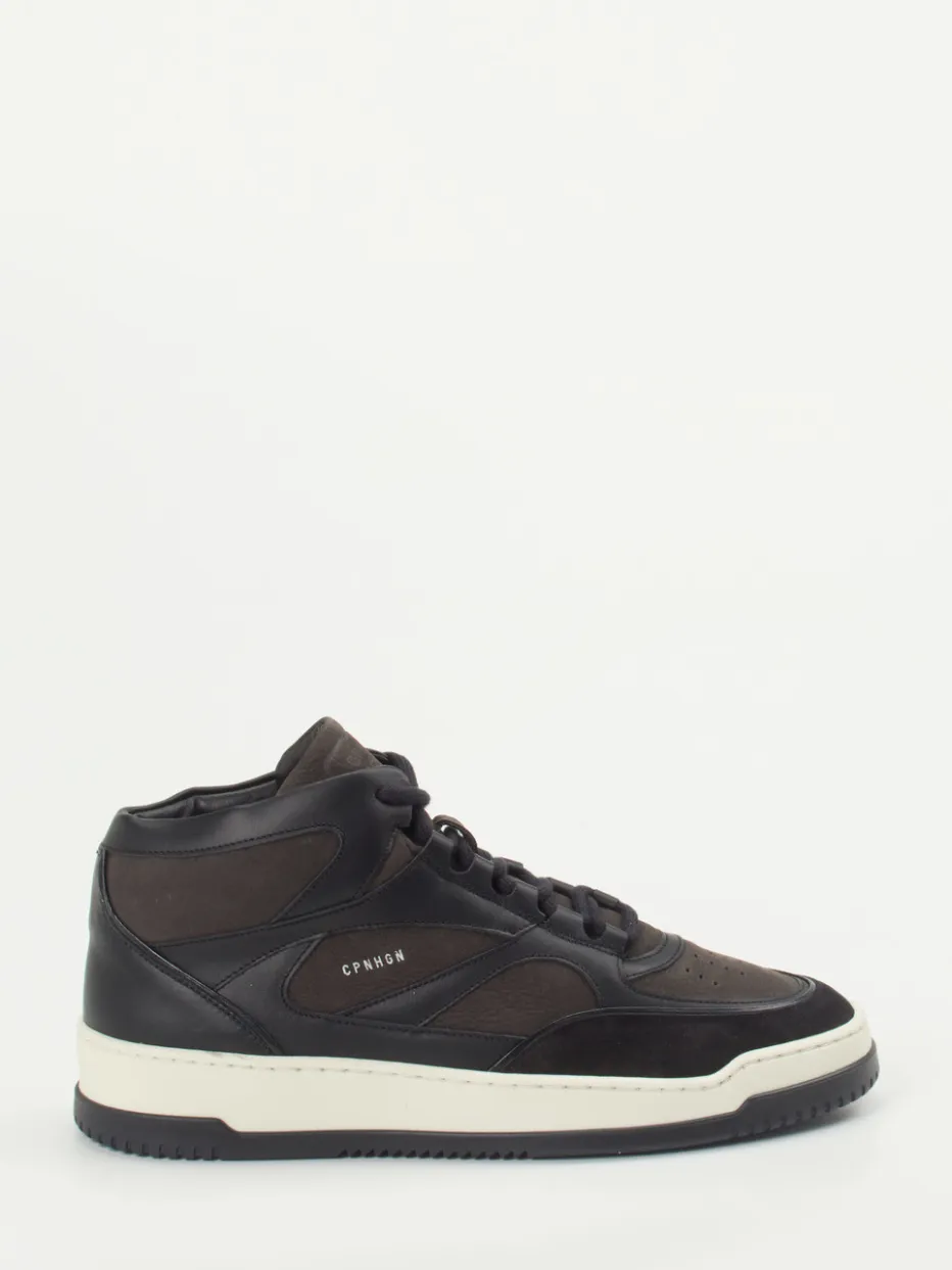 Retro-Flair trifft urbanen Minimalismus.Der Mid-Top-Sneaker von Copenhagen präsentiert sich als stilvoller Herren-Sneaker mit Streetwear-Attitüde. Ideal für entspannte City-Outfits oder den abendlichen Ausgeh-Look: Das Modell besteht aus hochwertigem Kalbleder, in einer kombinierten Ausführung aus leicht genarbtem Glatt- und samtigem Veloursleder. Das dunkle Braun wirkt maskulin und dezent, unterstützt von schwarzen Details und einer kontrastierenden Offwhite-Gummisohle mit sportlicher Profilstruktur. Perforierte Zehenpartie, gepolsterter Schaft und dezentes CPHGN-Branding unterstreichen den minimalistischen Sneaker-Charakter mit Retro-Basketball-Anleihen. Harmoniert besonders gut zu Jogpants oder gekrempelten Jeans. Stylisch-reduziert mit dänischem Understatement.