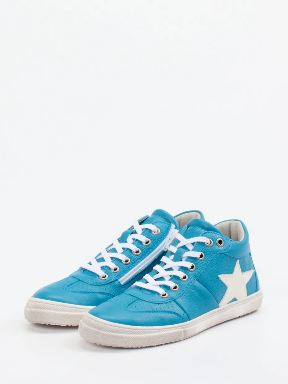 Eyecatcher mit praktischem Komfort.Däumling präsentiert diesen Mid-Top Sneaker für Kinder. Das Modell aus genarbtem Kalbleder in kräftigem Türkisblau richtet sich an Kinder mit Sinn für Farbe und Bewegung im Alltag. Das sportlich-runde Design betont Funktion und Stil gleichermaßen: Schnürung und Reißverschluss erleichtern das Anziehen, die weiße Gummisohle sorgt für Rutschfestigkeit. Ein Stern als Applikation setzt zugleich einen modischen und kindgerechten Akzent. Farblich kontrastierendes Textilfutter in Hellgrau ergänzt das Gesamtbild harmonisch. Inspiriert vom Retro-Court-Trend meldet sich Streetwear in neuer, frischer Ausprägung. Flexibilität, Halt und Stil – typisch Däumling.