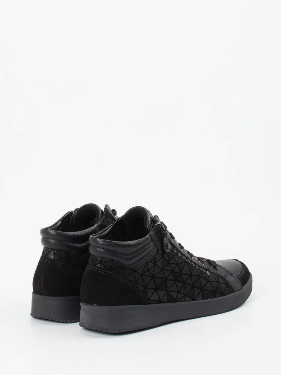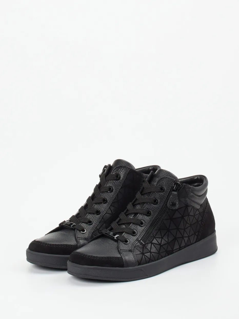 Komfort in schwarz geprägt.Ara präsentiert mit diesem Mid-Top-Sneaker ein komfortorientiertes Modell für Damen. Die schwarze Variante aus geprägtem Leder kombiniert eine genarbte Oberfläche mit weichem Veloursanteil an ausgewählten Partien. Dank der HighSoft-Technologie, Rundumpolsterung und des gepolsterten Schaftrands garantiert der Schuh langanhaltenden Komfort. Der seitliche Reißverschluss ergänzt die klassische Schnürung funktional, während das geometrische Ton-in-Ton-Muster moderne Akzente setzt. Die rutschhemmende Gummisohle bietet sicheren Tritt im urbanen Alltag. Der Sneaker harmoniert besonders mit monochromen Herbst-Looks und casual inspirierten Outfits. Mit Ara-typischer Leichtigkeit für stilbetonte Gehmomente ausgestattet.