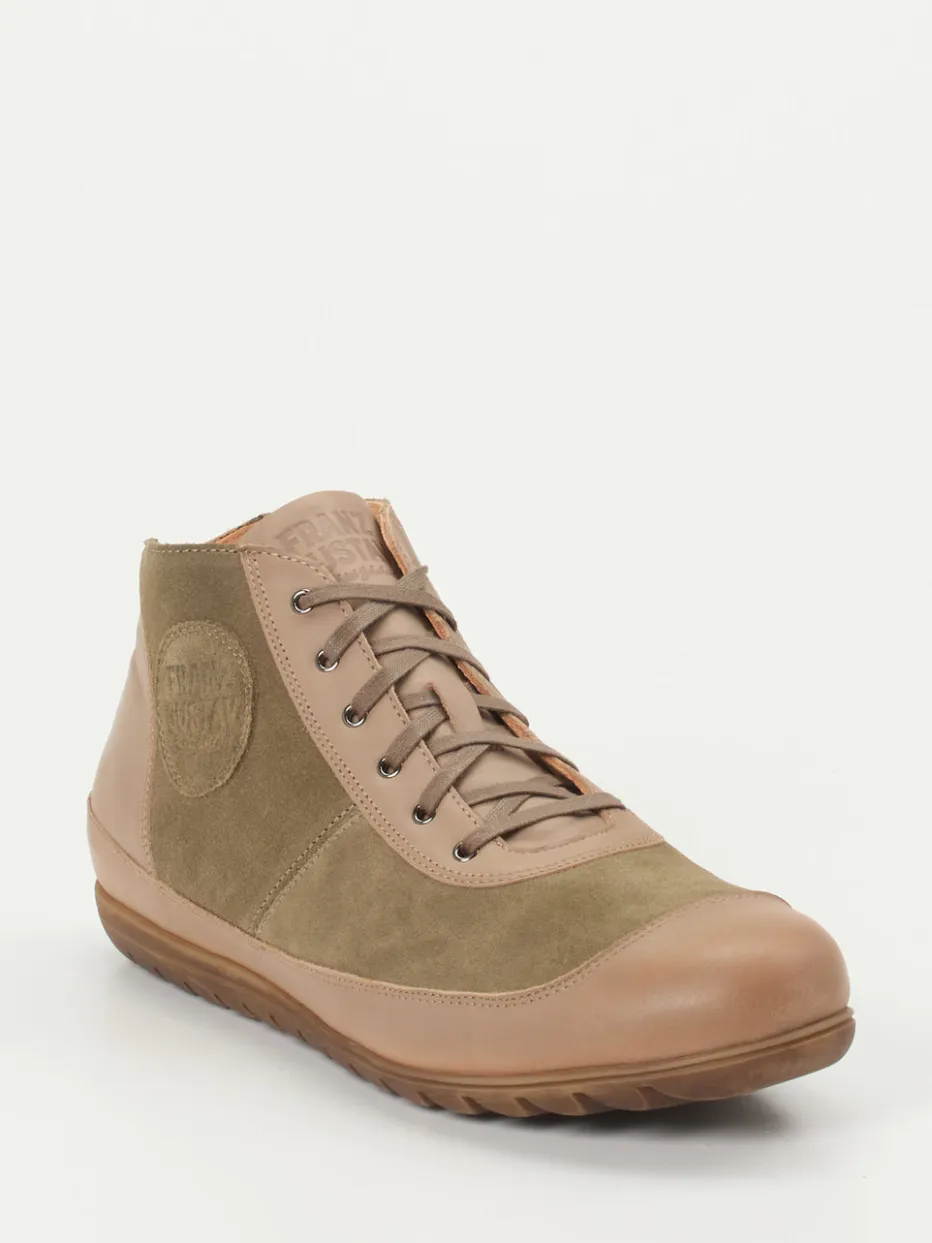 Minimalistisch mit urbanem Charakter.Der Mid-Top Sneaker von Franz Gustav verbindet Designkompetenz mit subtiler Funktionalität. Ideal für Spaziergänge durch die Stadt oder entspannte Wochenendtrips bietet das Modell aus taupefarbenem Veloursleder mit olivgrünen Akzenten eine kompakte Form mit matt-glänzender Oberfläche. Die Schnürung mit Metallösen sorgt für festen Halt, während die stark profilierte Gummisohle und der gummierte Zehenschutz funktionale Sicherheit gewährleisten. Dezente Ton-in-Ton-Nähte und ein geprägtes Markenlogo unterstreichen die minimalistische Ästhetik – perfekt für moderne „Quiet Luxury“-Outfits. Hochwertige Lederverarbeitung mit urbanem Designverständnis – typisch Franz Gustav.