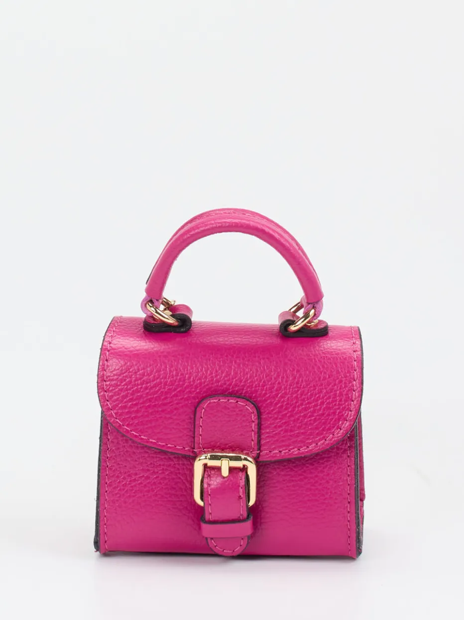 Bezaubernd ist diese Minitasche aus dem Hause Marlon Firenze. Das pinke Kalbleder wird zum Hingucker und peppt so jede Garderobe auf. Mit Hilfe der eleganten, goldfarbenen Schulterkette kann Sie lässig umgehängt werden. Schick ist die dekorative, goldfarbene Gürtelschnalle unter der sich ein praktischer Druckknopf verbirgt. Der Innenraum bietet Platz für ein kleines Portemonnaie und einen Lippenstift. An einem zusätzlichen, goldfarbenen Haken kann z.B. der Schlüssel befestigt werden. Ein süßes Accessoire, das Spaß macht! – Material: Kalbleder – Farbe: Pink – Größe: ca. 10 x 12 x 6 cm (H x B x T) – Verschluss: Druckknopf – Schulterriemen: ca. 115 cm, abnehmbar